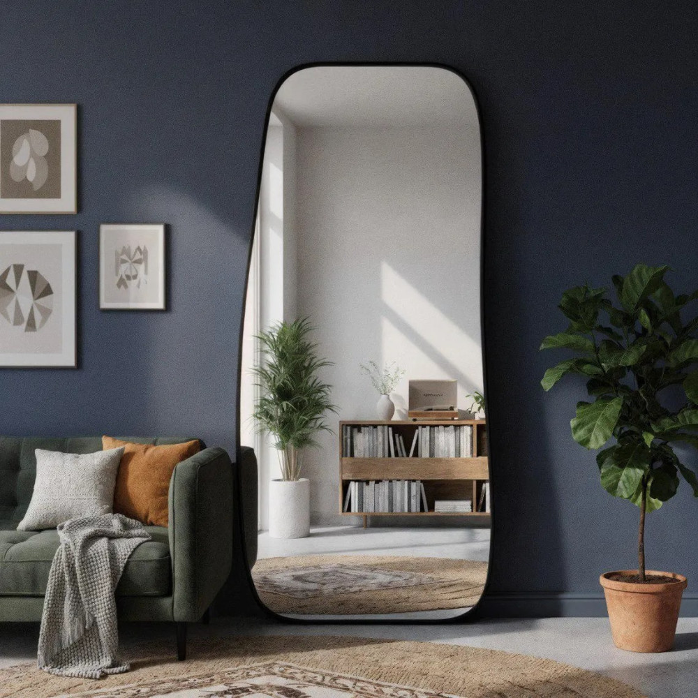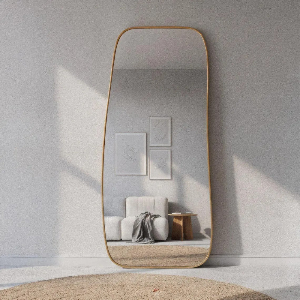Напольное и настенное большое асимметричное зеркало в полный рост в золотой раме Эдда