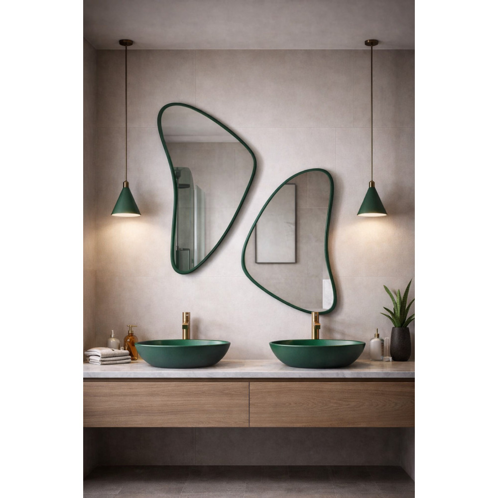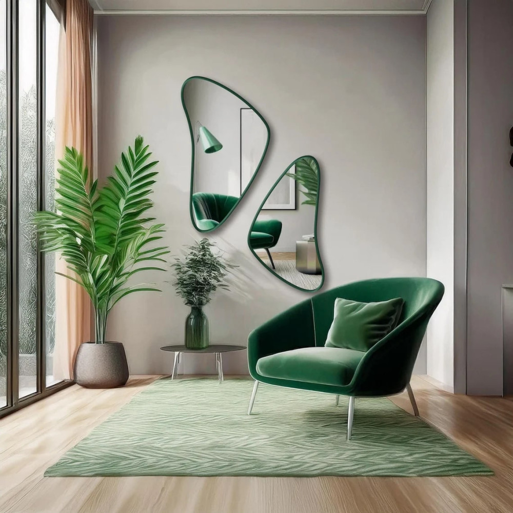 Настенное дизайнерское зеркало неправильной формы в зелёной раме Кадера
