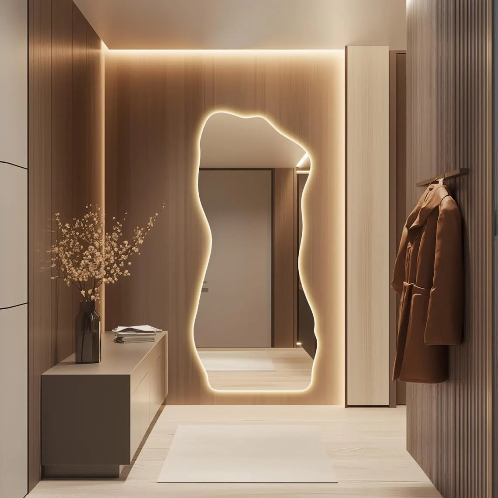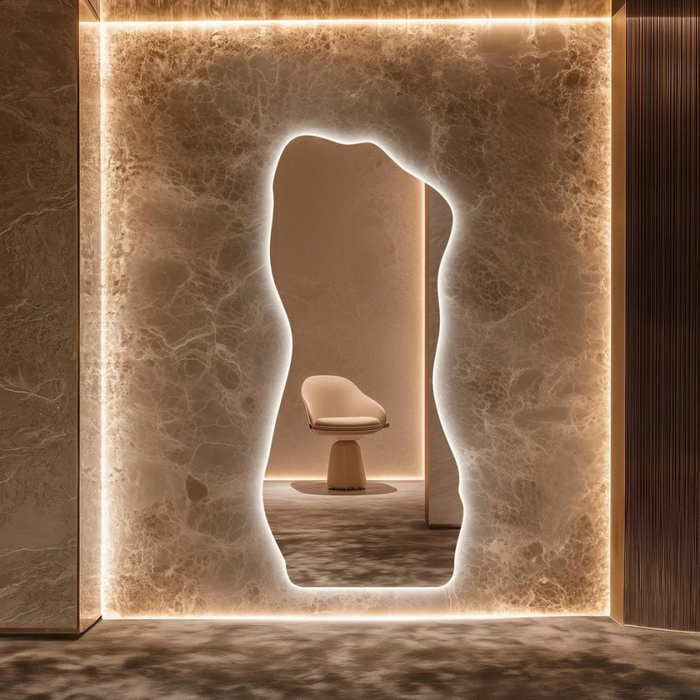 Зеркало E016 — современное и элегантное решение для тех, кто ценит стиль, свет и гармонию в интерьере. Благодаря парящей LED-подсветке, зеркало создаёт эффект мягкого свечения по периметру, визуально отделяясь от стены и придавая пространству глубину и лёгкость.