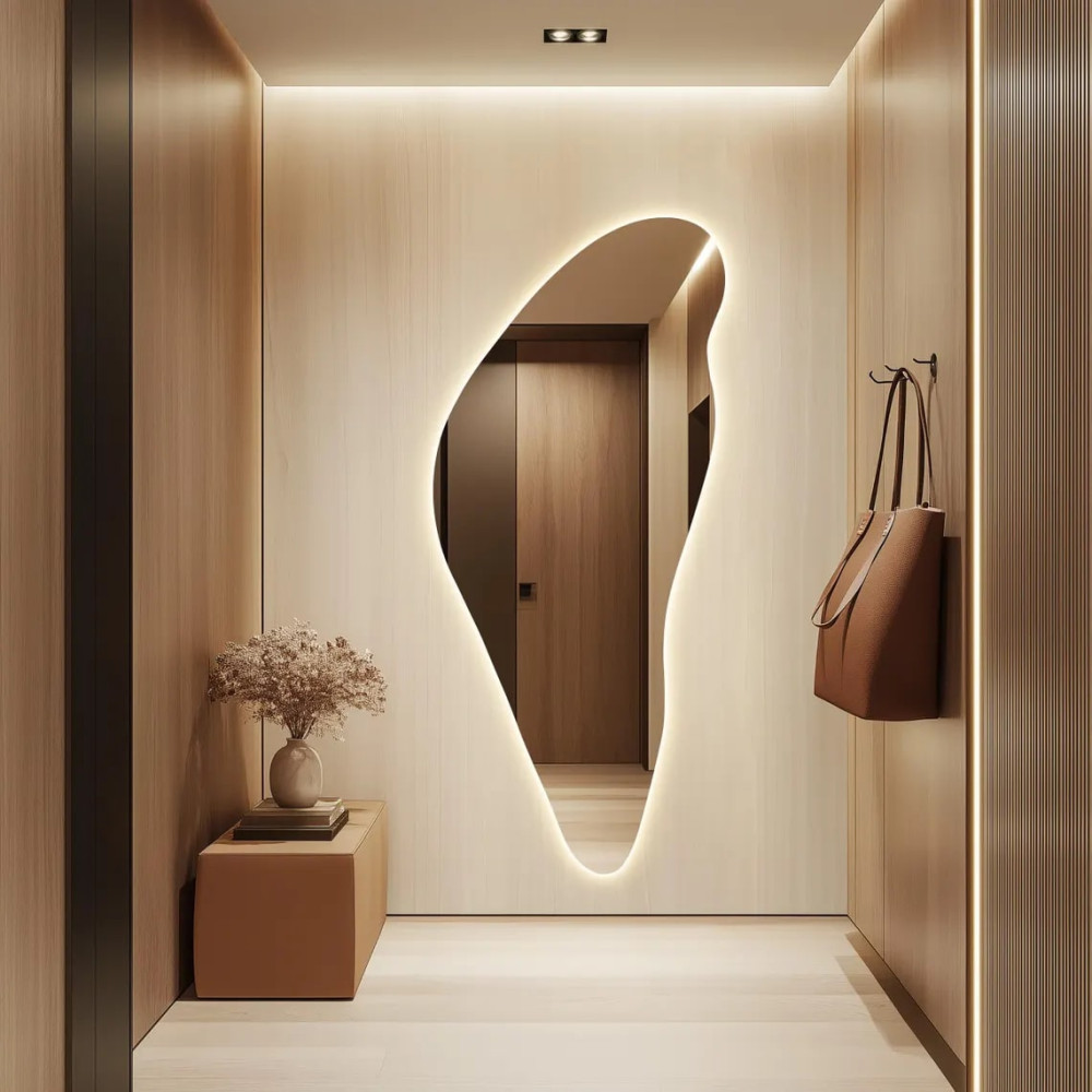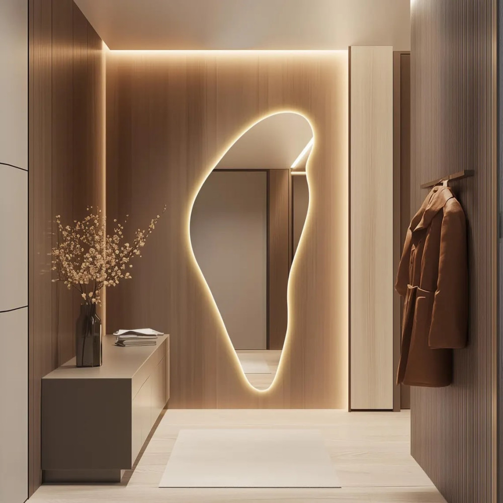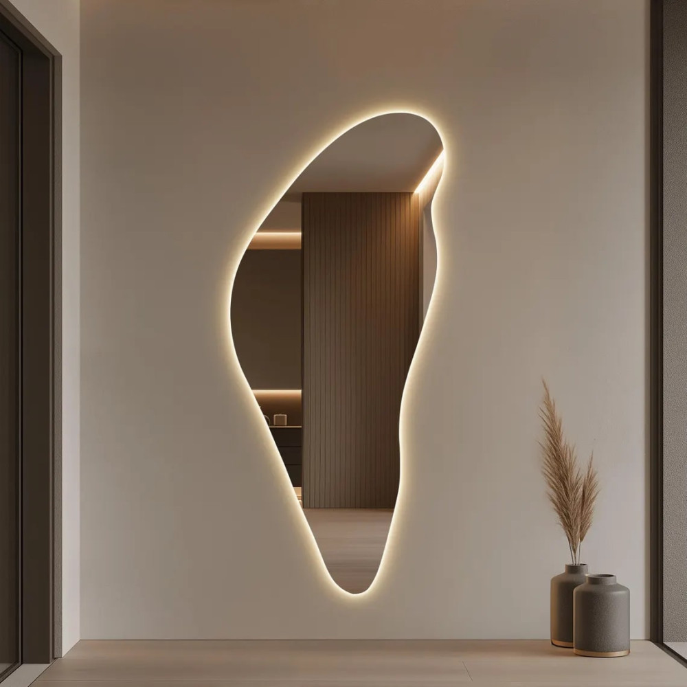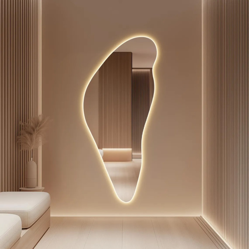Большое настенное зеркало необычной формы в полный рост с фоновой Ambilight-подсветкой E033