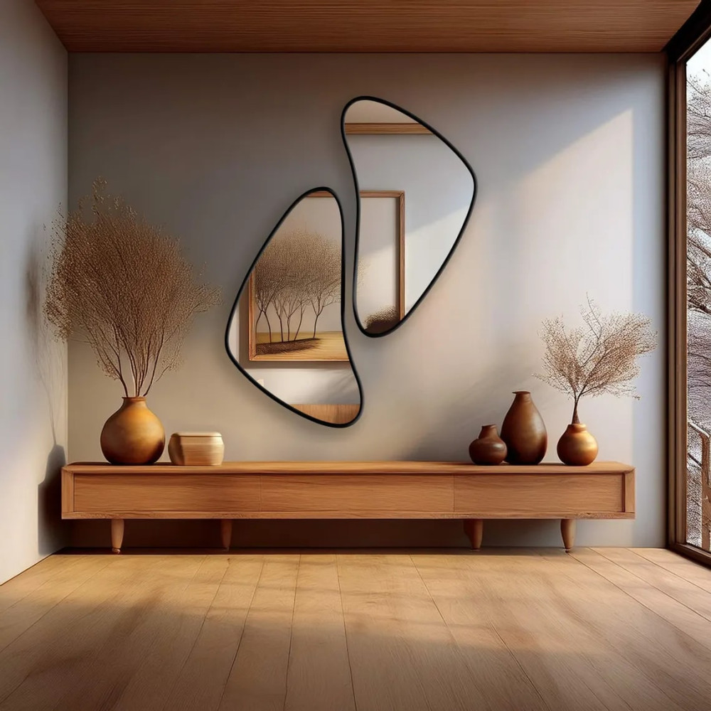 Настенное дизайнерское зеркало неправильной формы в чёрной раме Кадера