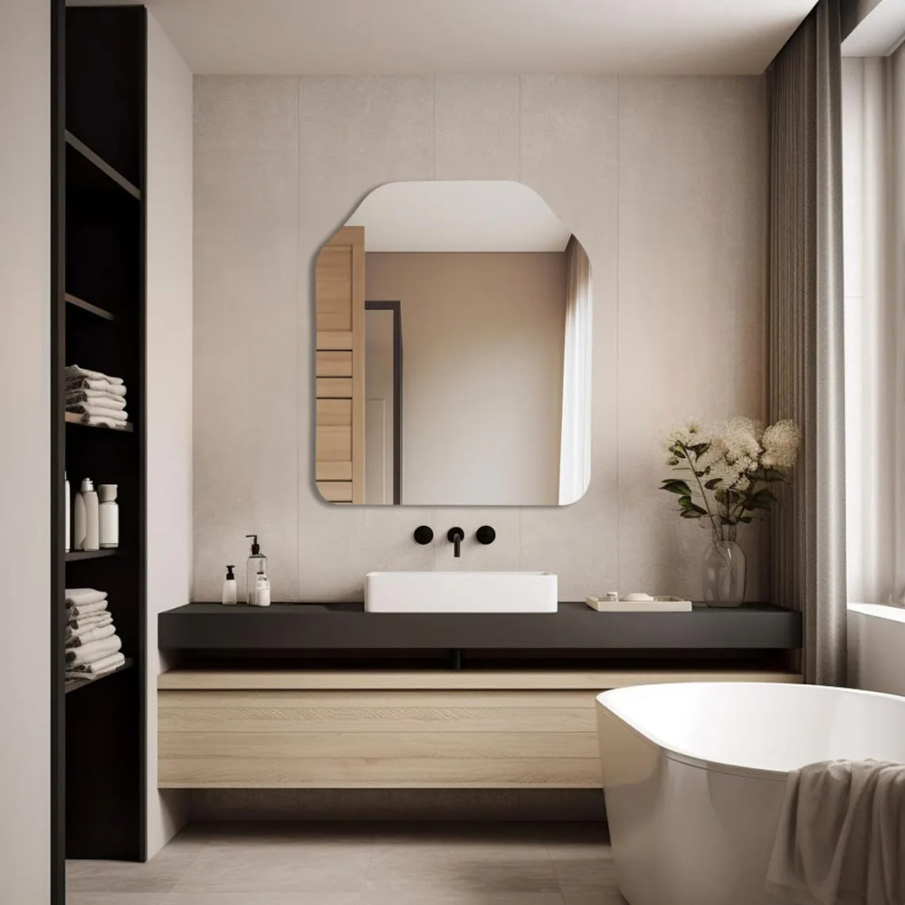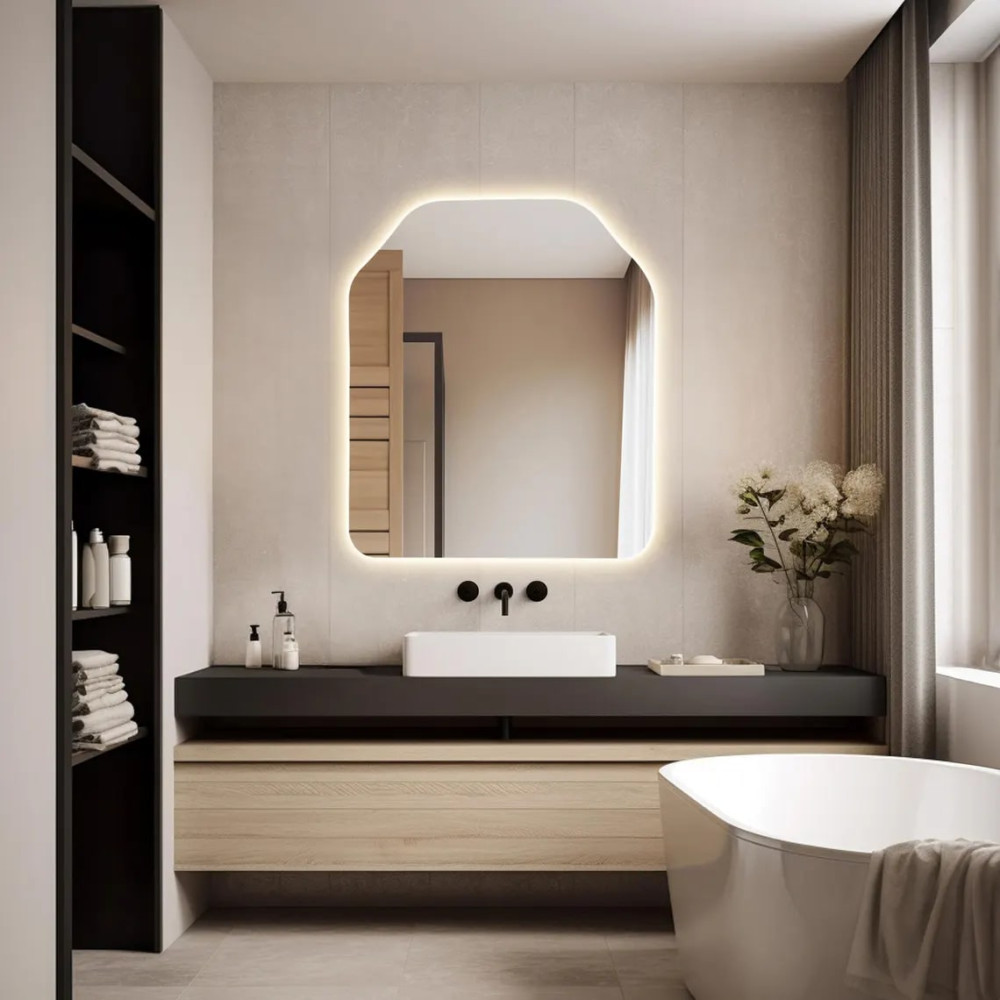 Зеркало E076 — это современный декоративный акцент, созданный для тех, кто ценит стильные формы и атмосферный свет. Уникальный дизайнерский силуэт зеркала подчёркивает индивидуальность интерьера, а мягкая фоновая интерьерная подсветка создаёт выразительное свечение, визуально отделяя зеркало от стены.
