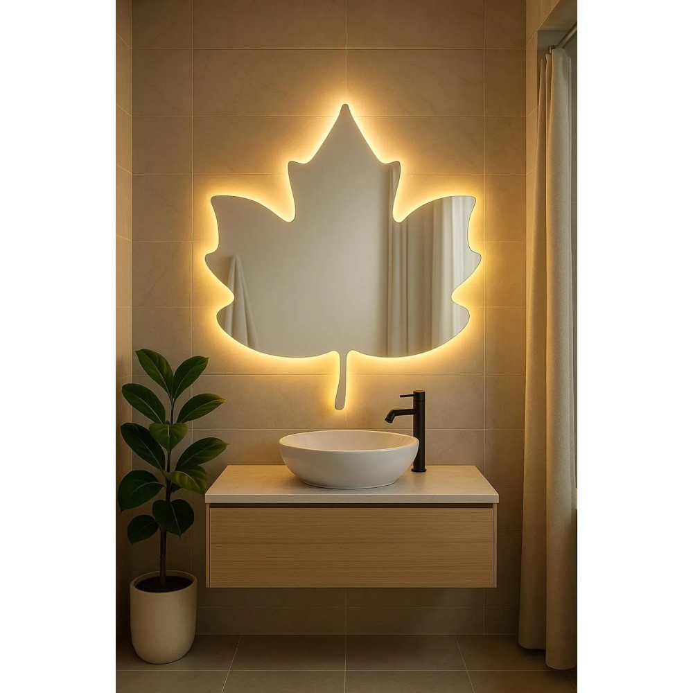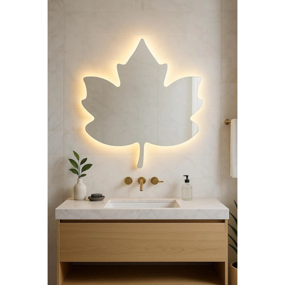 Встроенная светодиодная подсветка подчёркивает форму листа, создаёт мягкое контурное свечение и визуально отделяет зеркало от стены. Благодаря этому появляется эффект лёгкости и дополнительной глубины, а интерьер становится более уютным и стильным.