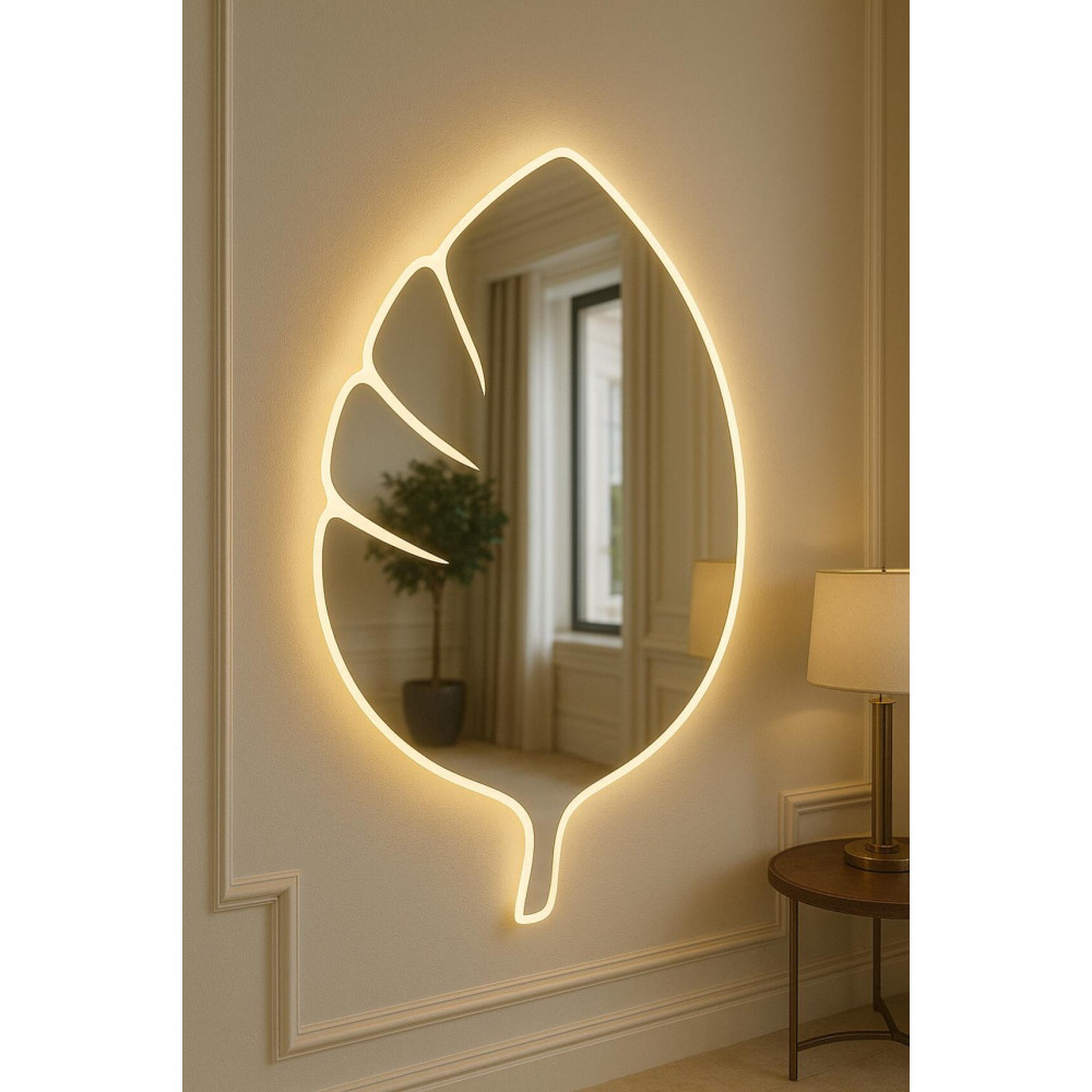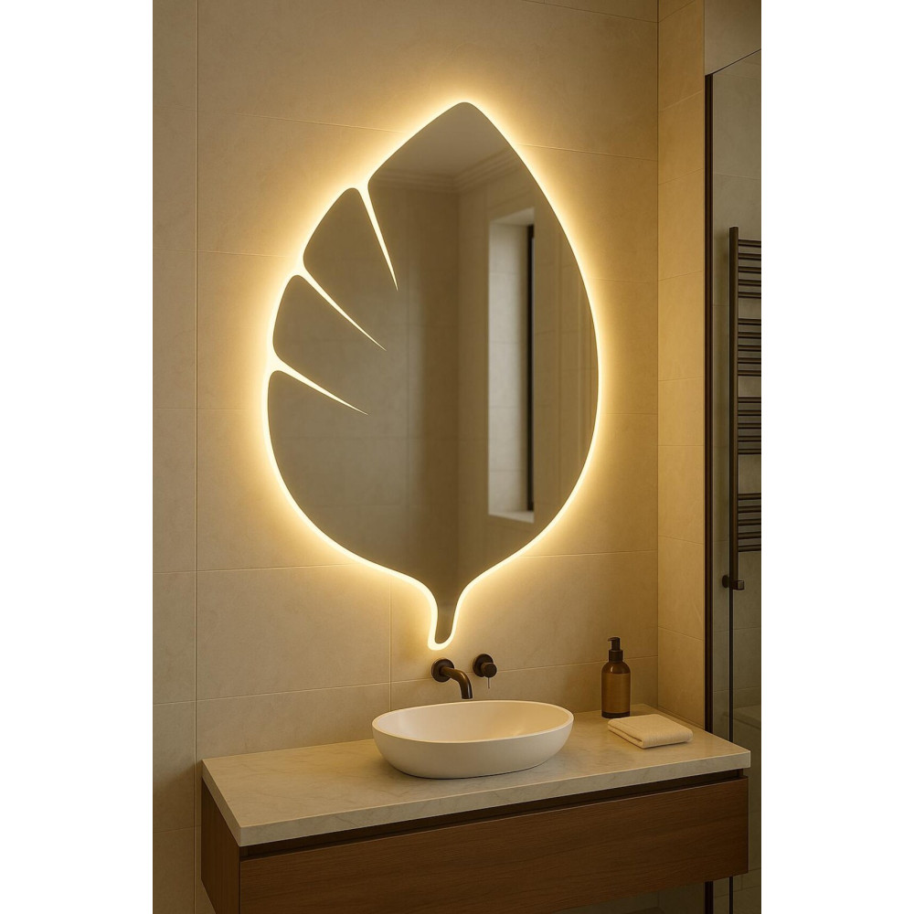 Тыльная контурная LED-подсветка формирует мягкое свечение по периметру, визуально отделяя зеркало от стены и добавляя интерьеру глубину и атмосферность. Такое подсвечивание подчёркивает форму листа и создаёт уютный, расслабляющий световой эффект.