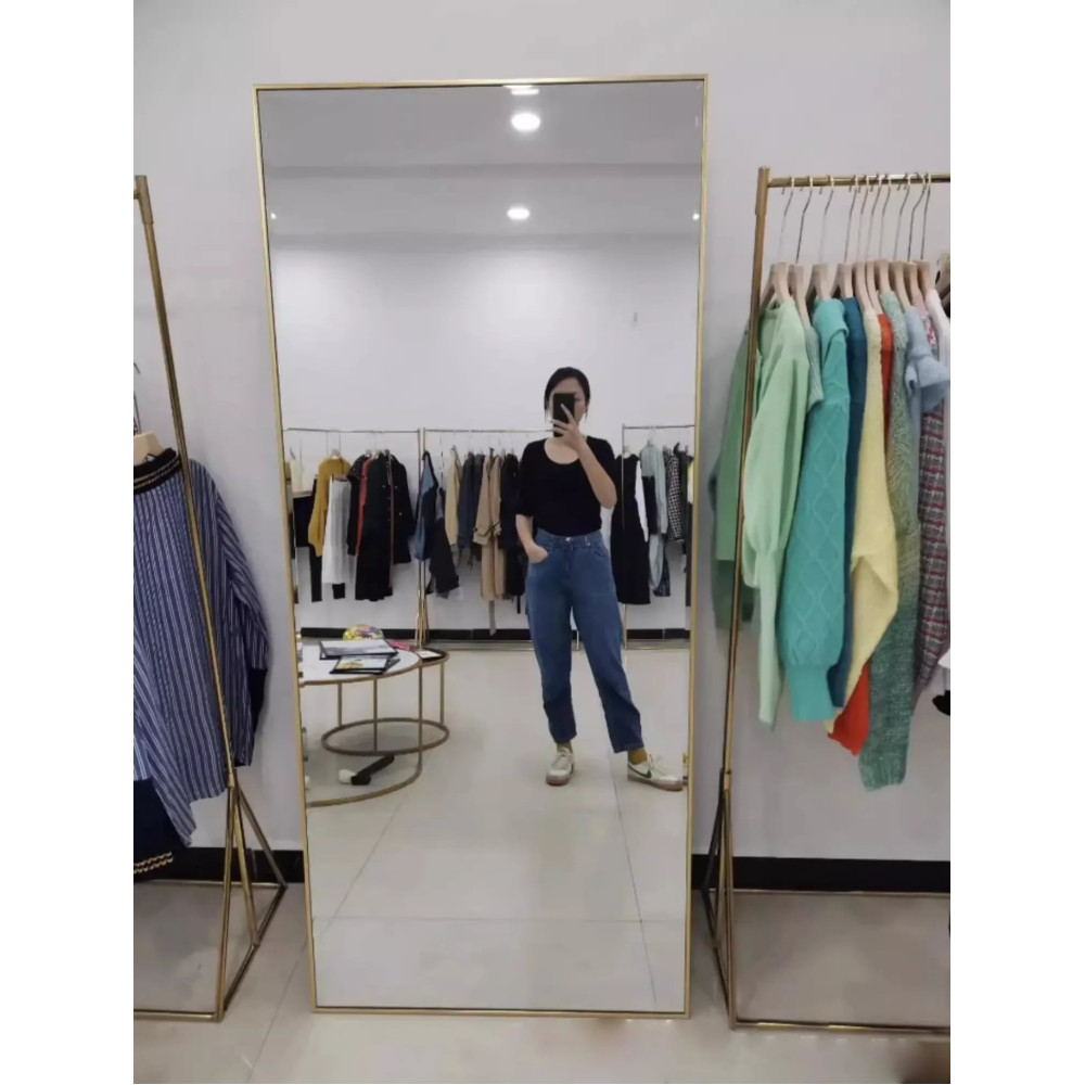 Напольное большое широкое зеркало в полный рост в золотой металлической раме на ножке-подставке Эмилия
