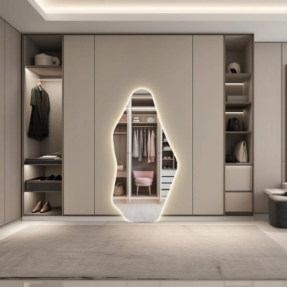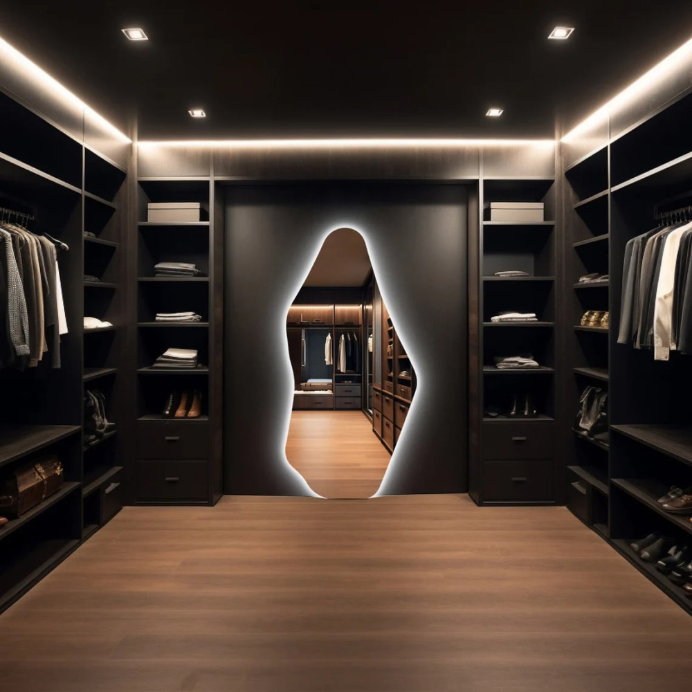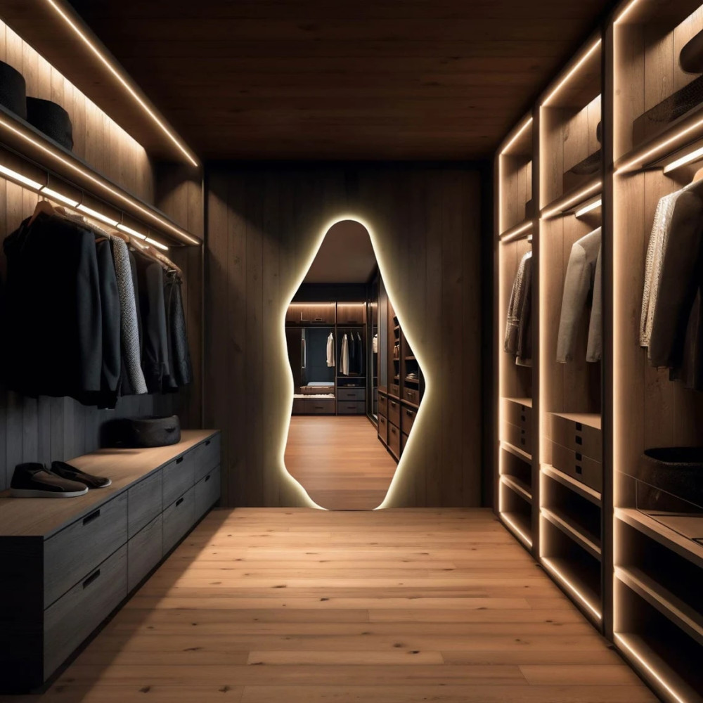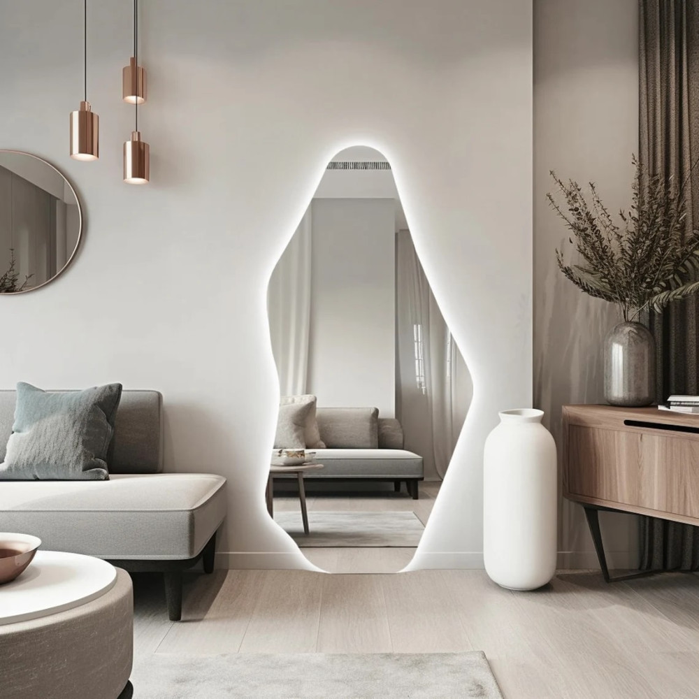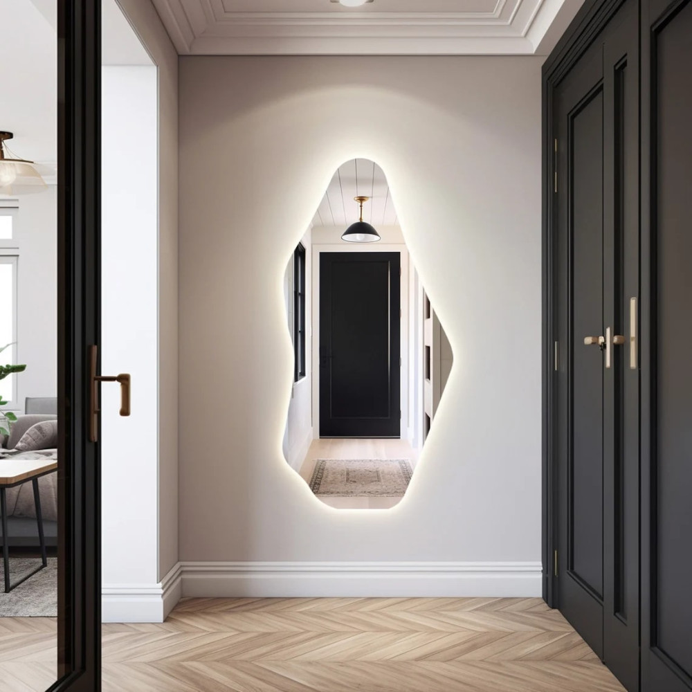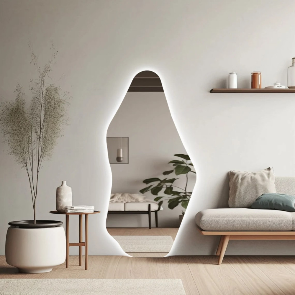 Зеркало E003 — это эффектный элемент современного интерьера, объединяющий оригинальный дизайн и продуманную функциональность. Благодаря асимметричной, нестандартной форме и тыльной фоновой подсветке, зеркало создаёт мягкое свечение, визуально увеличивает пространство и добавляет в интерьер ощущение лёгкости.