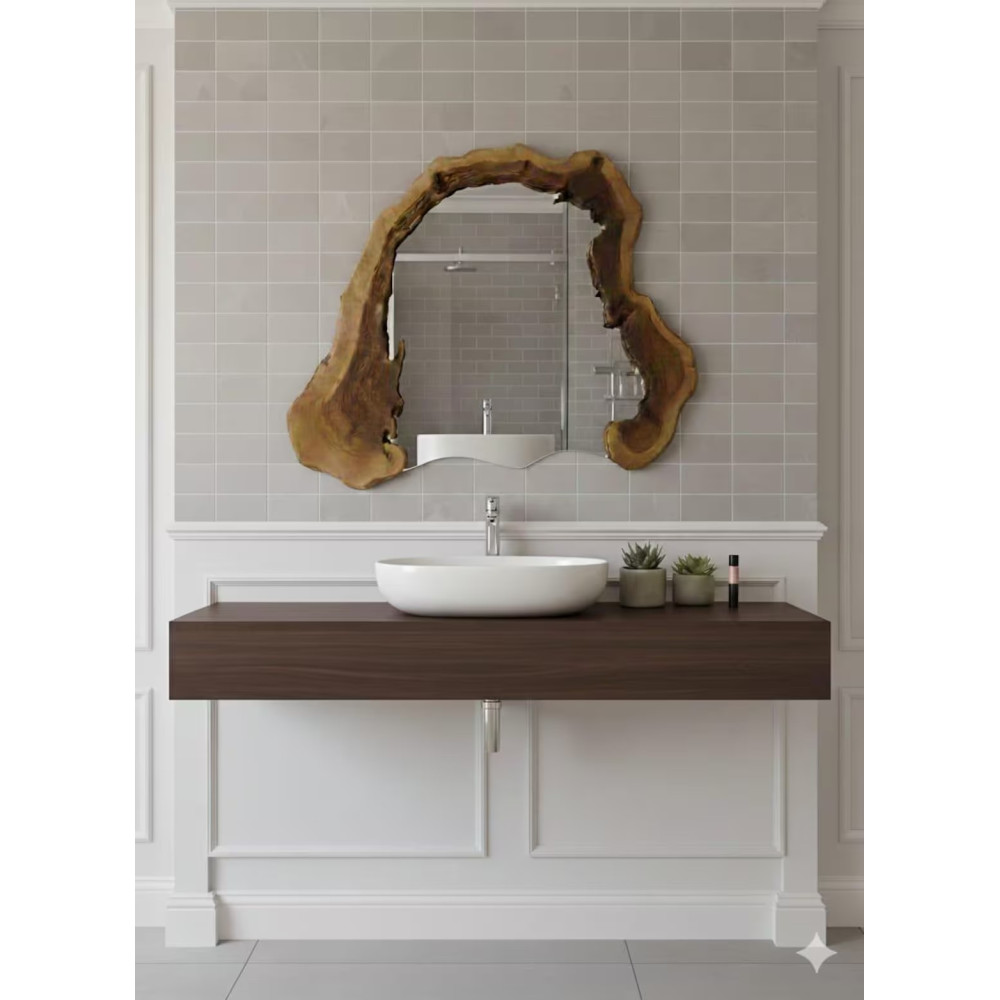 Модель MS005 — это манифест естественности. В природе не существует идеальных квадратов, и это зеркало следует тому же принципу. Сочетание плавной, «текучей» формы зеркального полотна и грубого, фактурного слэба создает динамичный арт-объект, который меняет восприятие пространства.