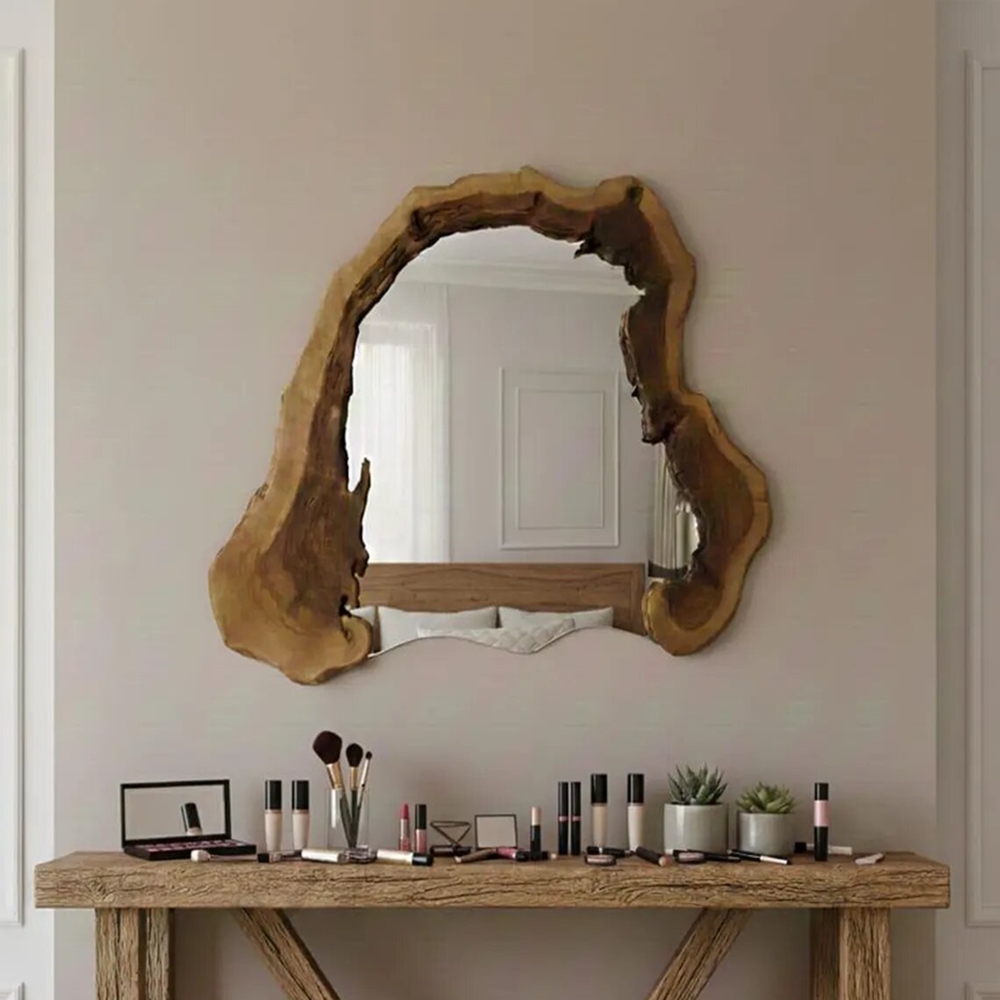 Уникальный силуэт: Неправильная форма зеркала визуально смягчает интерьер, делая его более живым и менее формальным.