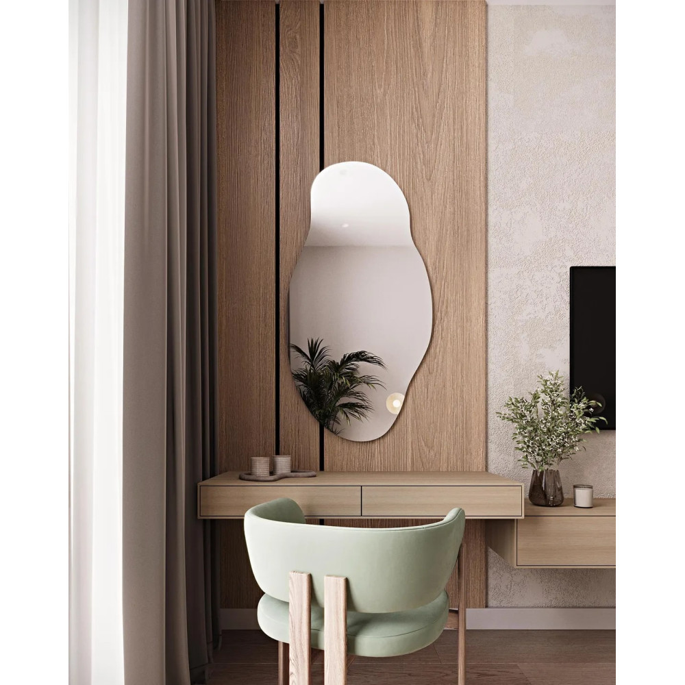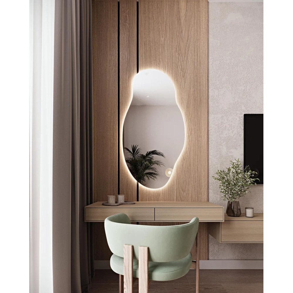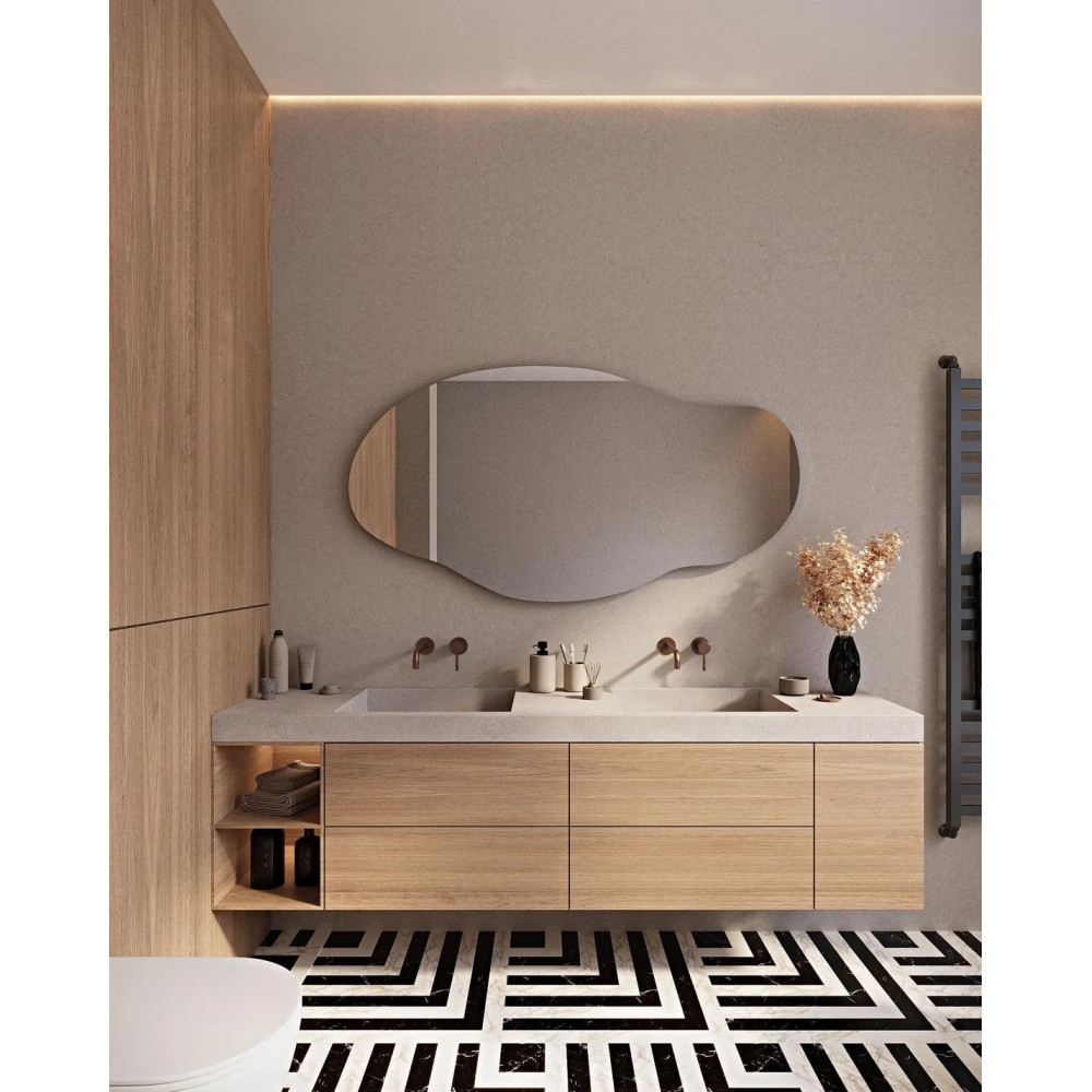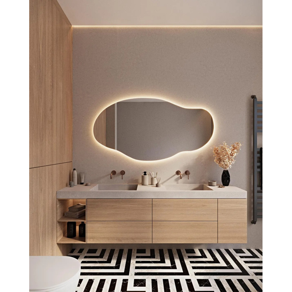 Зеркало E029 — стильное сочетание современного дизайна и мягкого светового оформления. Его асимметричная форма создаёт динамику и визуальный интерес, а Ambilight-подсветка по периметру добавляет мягкое, рассеянное свечение и эффект парения, делая пространство светлее и просторнее.