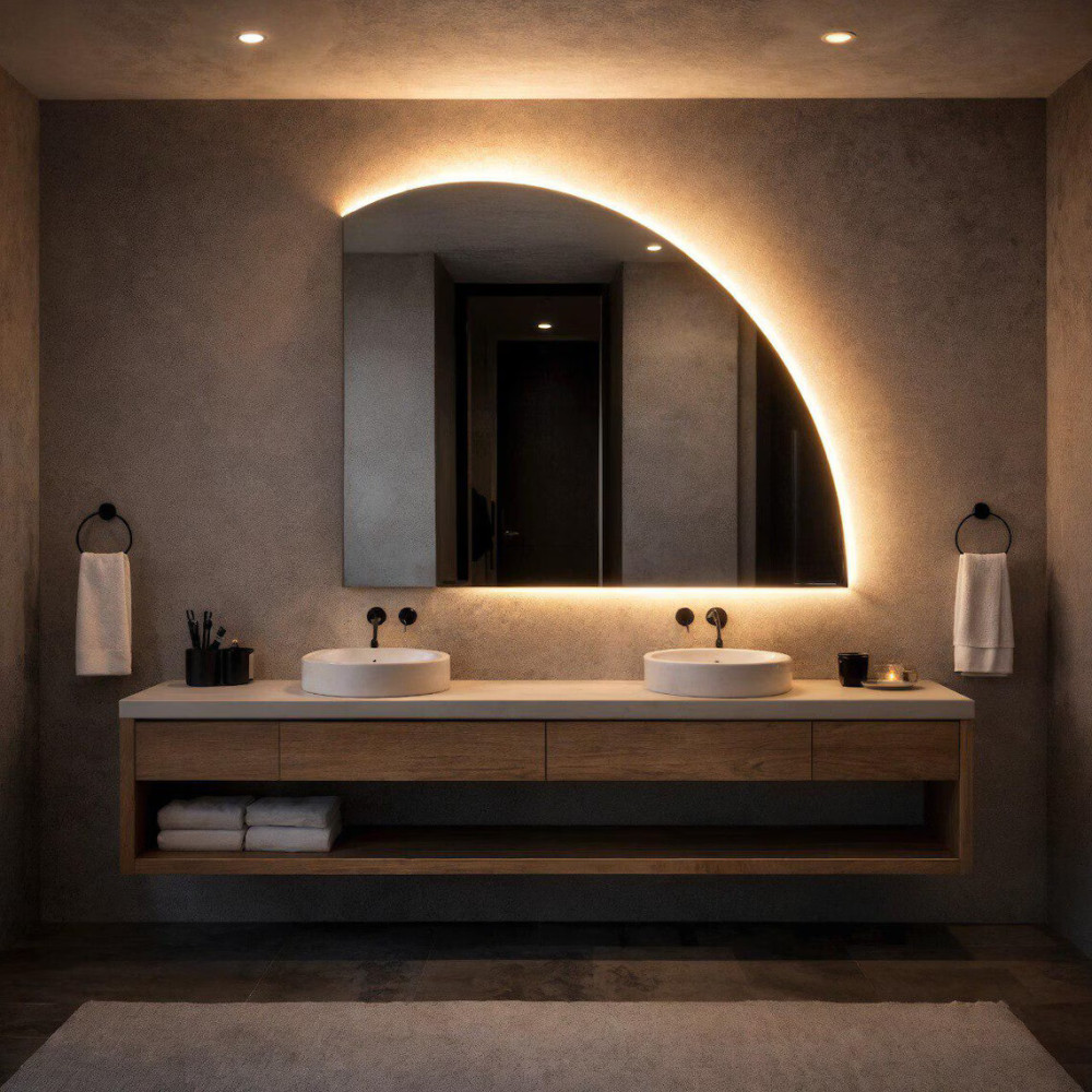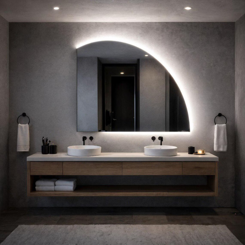 Зеркало «Эскалада 001» в форме четверти круга — это современное дизайнерское решение, которое ломает стереотипы о классических формах. Благодаря уникальной геометрии и мягкой интерьерной подсветке, модель создает эффект «парящего» зеркала, визуально расширяя пространство и добавляя глубину помещению.