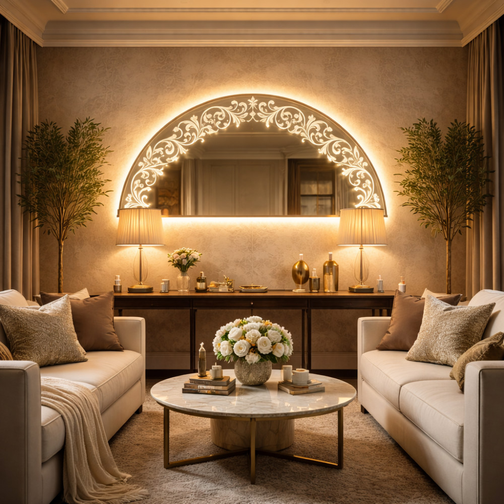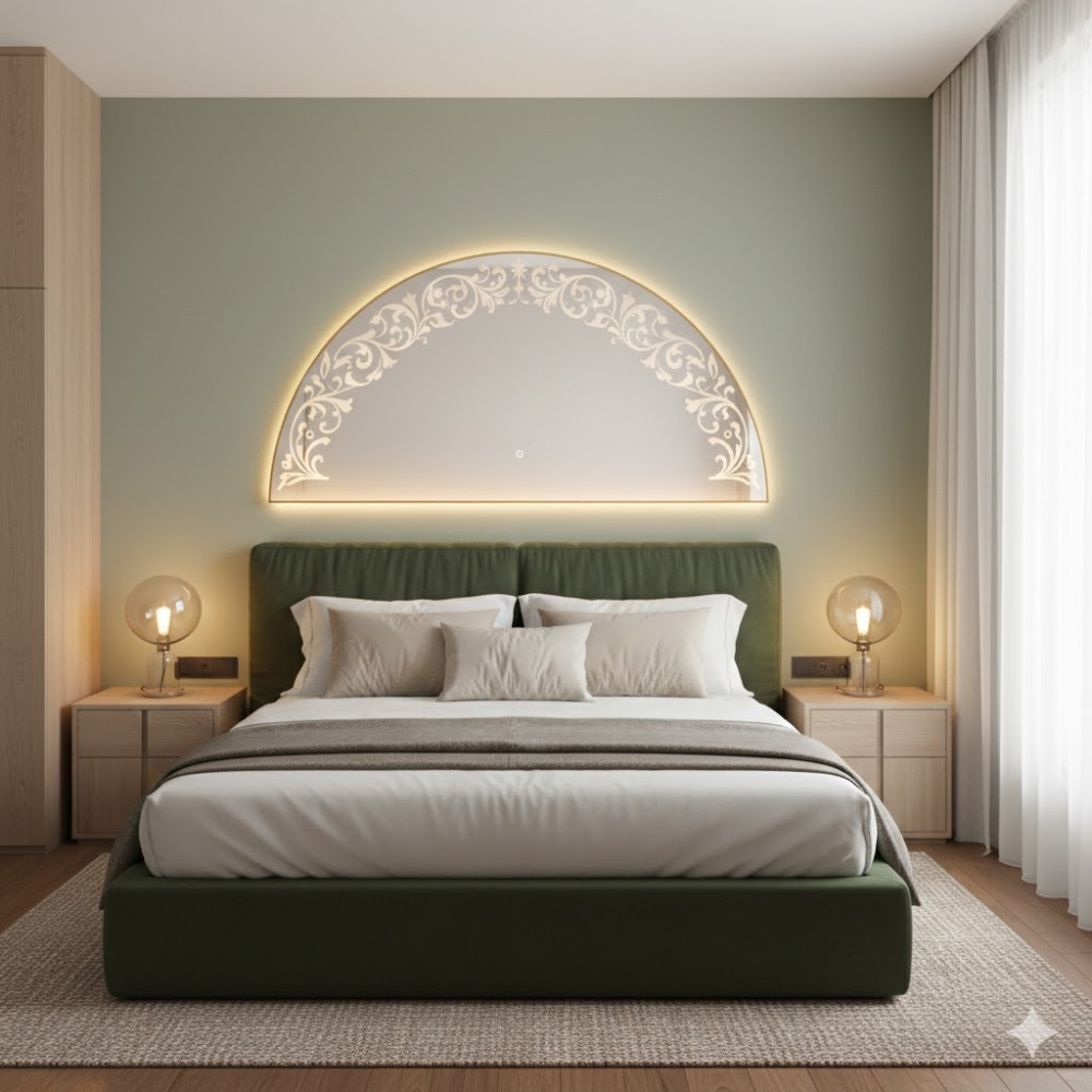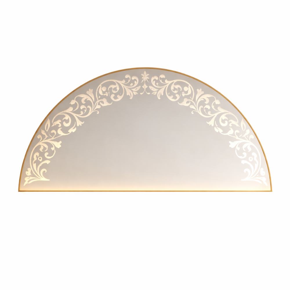 Зеркало «Эскалада 002» — это не просто предмет интерьера, а выразительный арт-объект. Полукруглая форма в сочетании с изысканной золотой рамой и мягкой подсветкой создает атмосферу уюта и современной роскоши в вашем доме.
