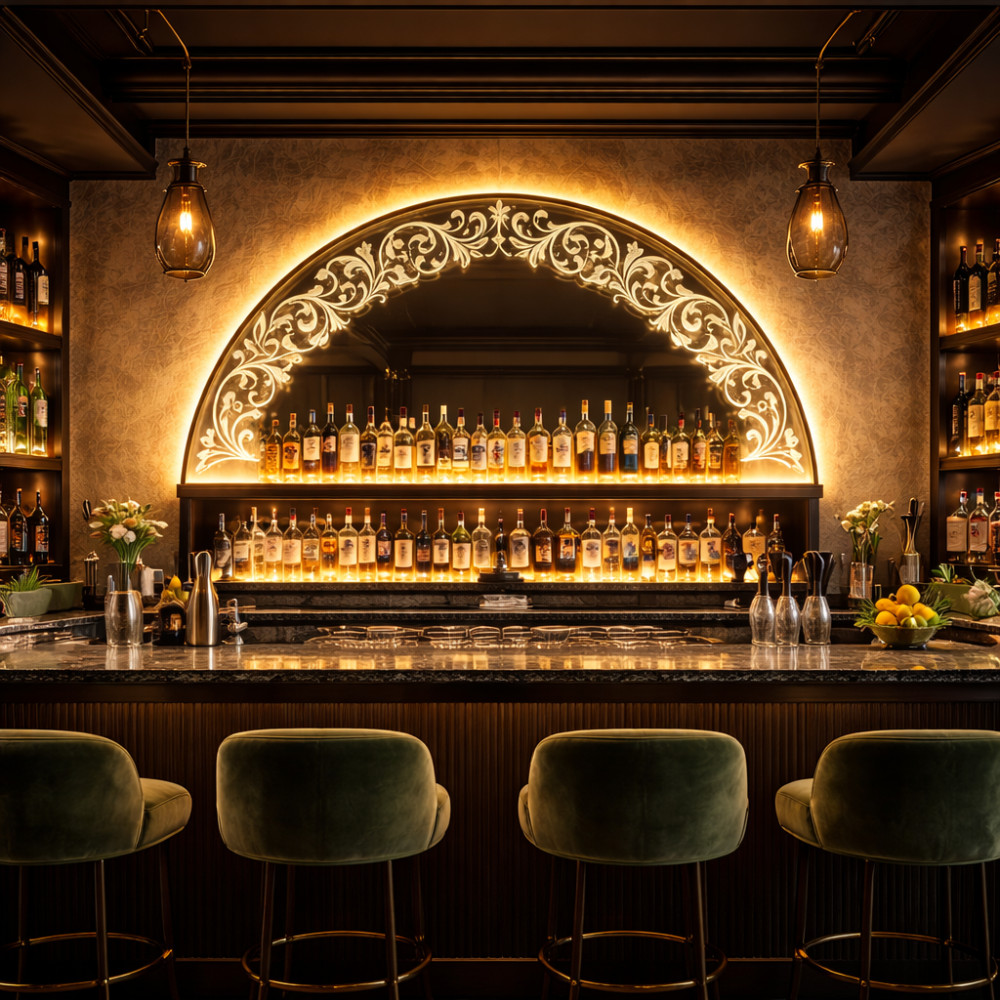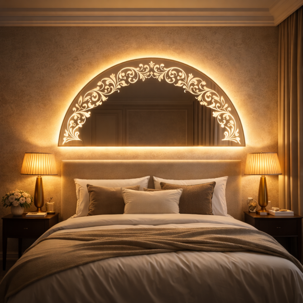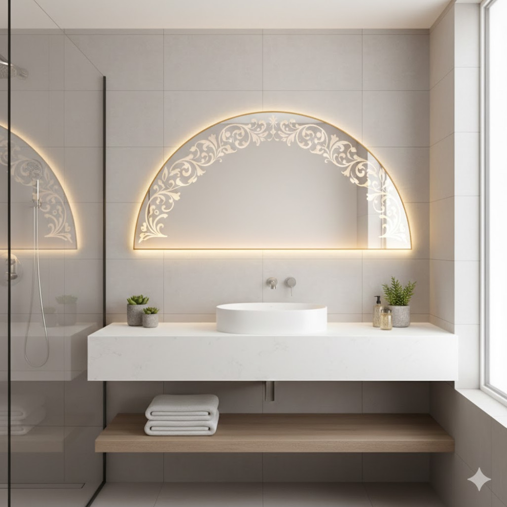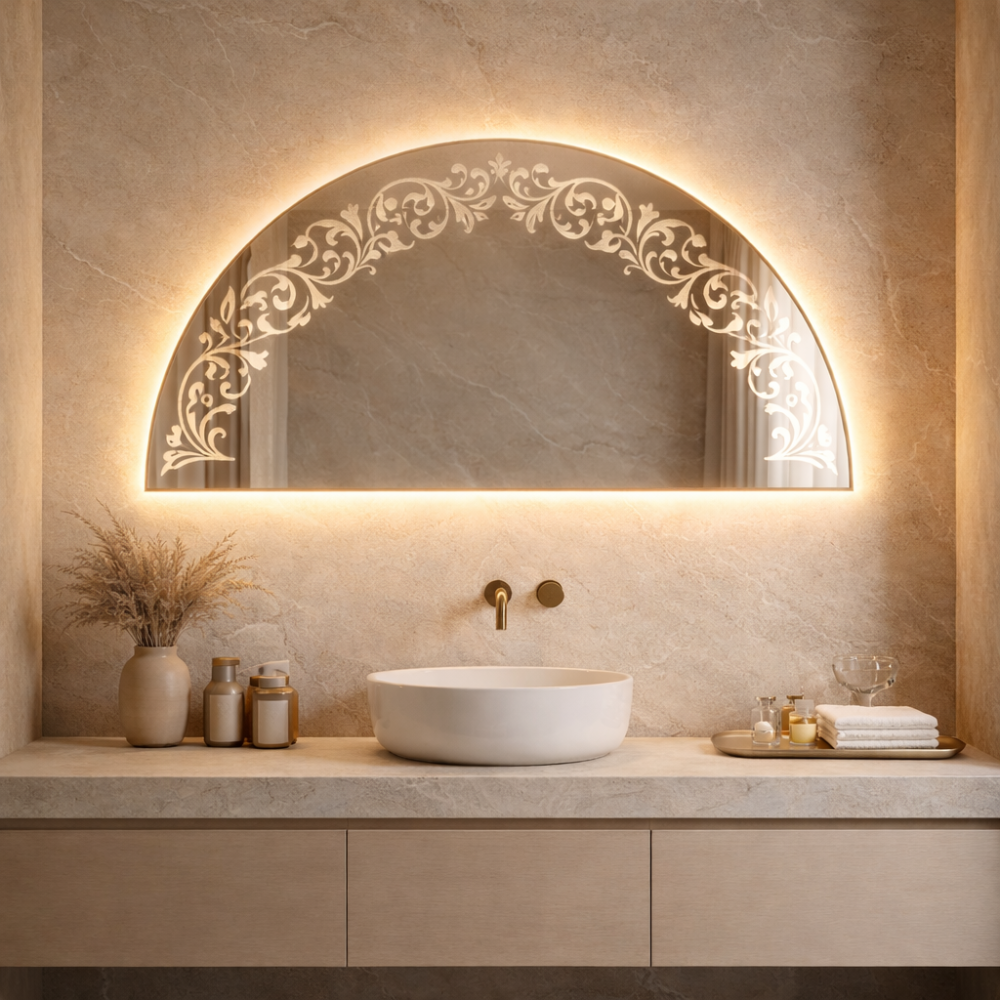 Пескоструйный узор: Филигранный рисунок на полотне придает зеркалу индивидуальность. При включении подсветки узор буквально оживает, создавая эффект объема.