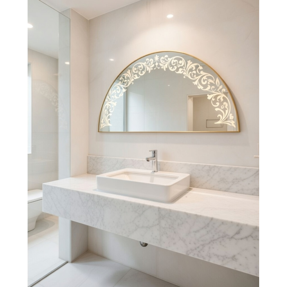Полукруглое настенное зеркало с пескоструйным узором с подсветкой в золотой раме Эскалада 002
