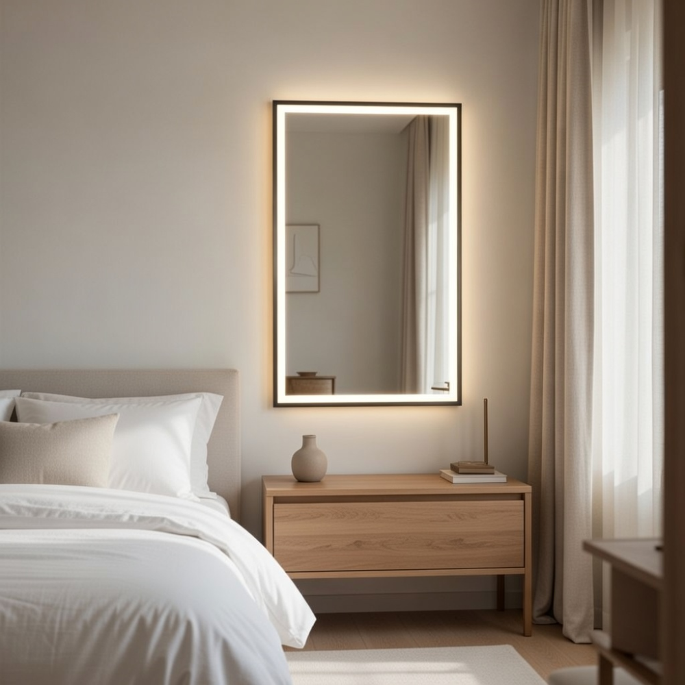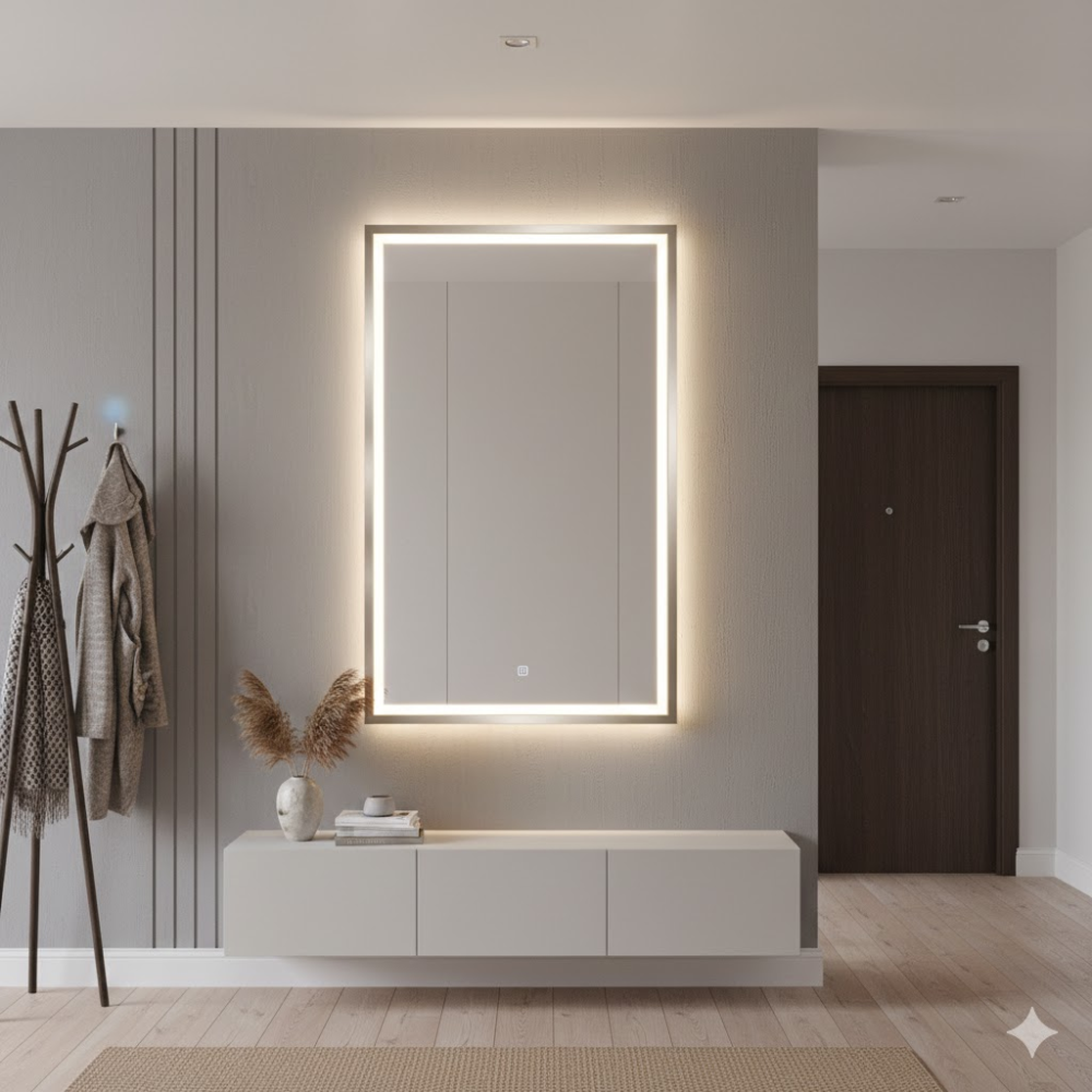 Задняя фоновая подсветка (Ambilight) создает эффект «парящего» зеркала, мягко подсвечивая стену и визуально расширяя пространство.