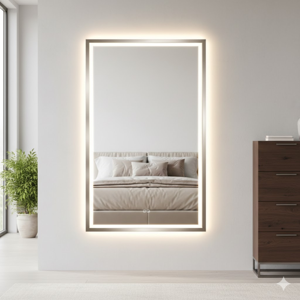 Добавьте глубины и футуристичности вашему интерьеру с моделью RF015. Это зеркало создано для тех, кто ценит идеальное отражение и мягкую атмосферную подсветку. Тонкая алюминиевая рама в цвете никель придает изделию завершенный, дорогой вид, который впишется как в современный минимализм, так и в неоклассику.