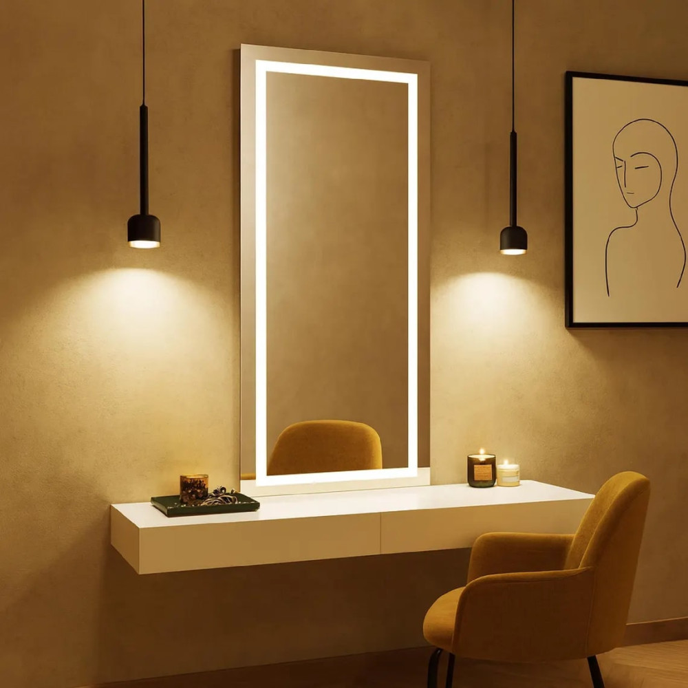 Для профессионального макияжа рекомендуем использовать зеркала с лампочками или зеркала с фронтальными пескоструйными световыми полосами с усиленной яркостью, нейтральным дневным светом и закрытым свечением(сзади зеркала свет не падает на стену).