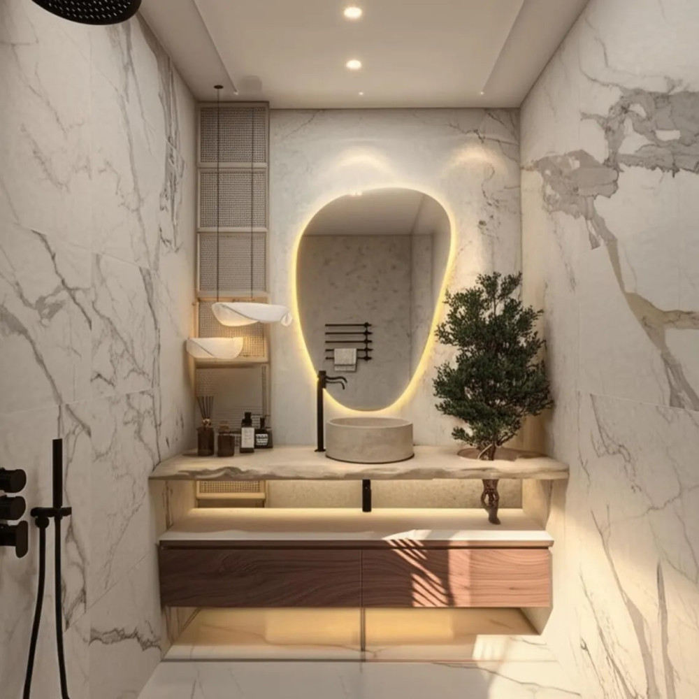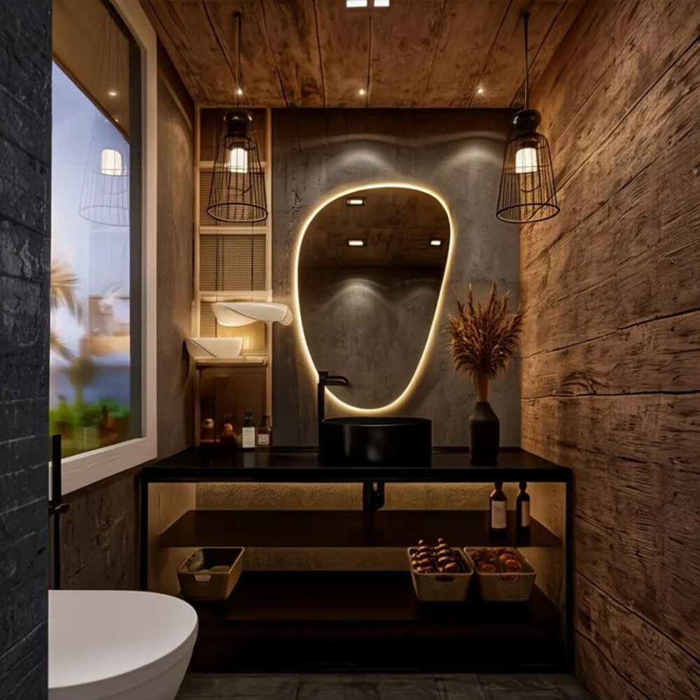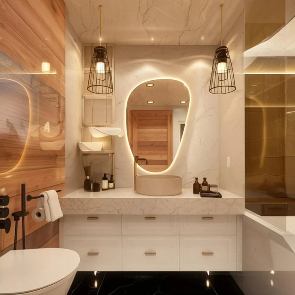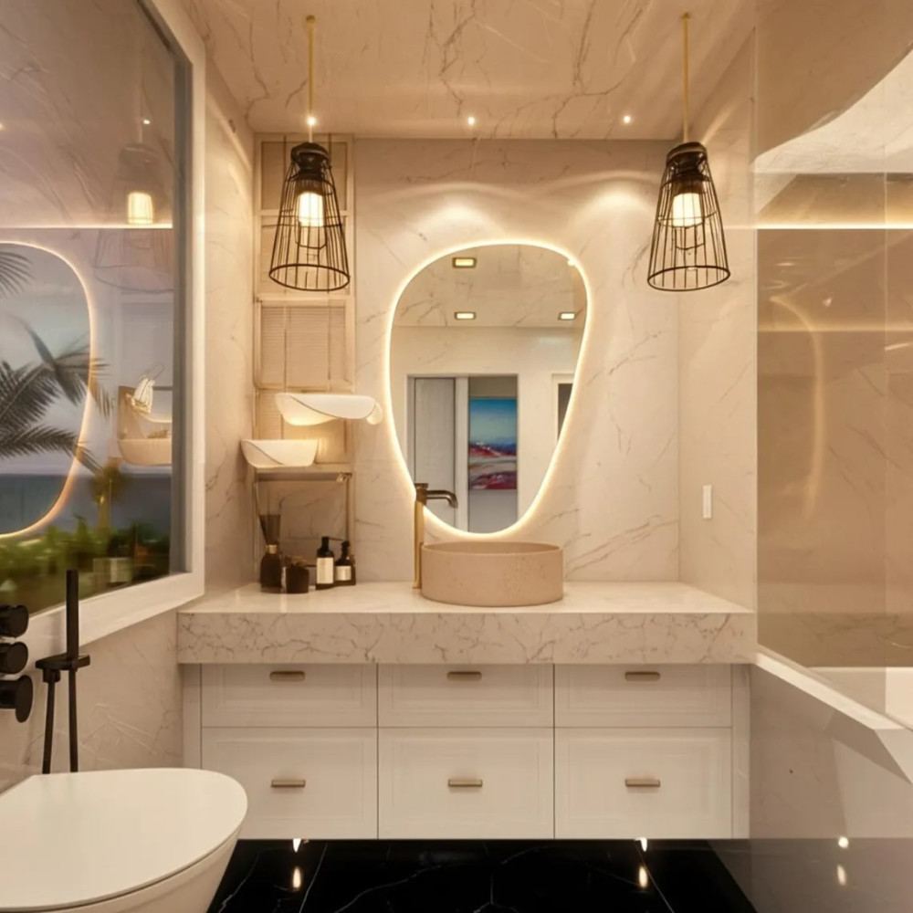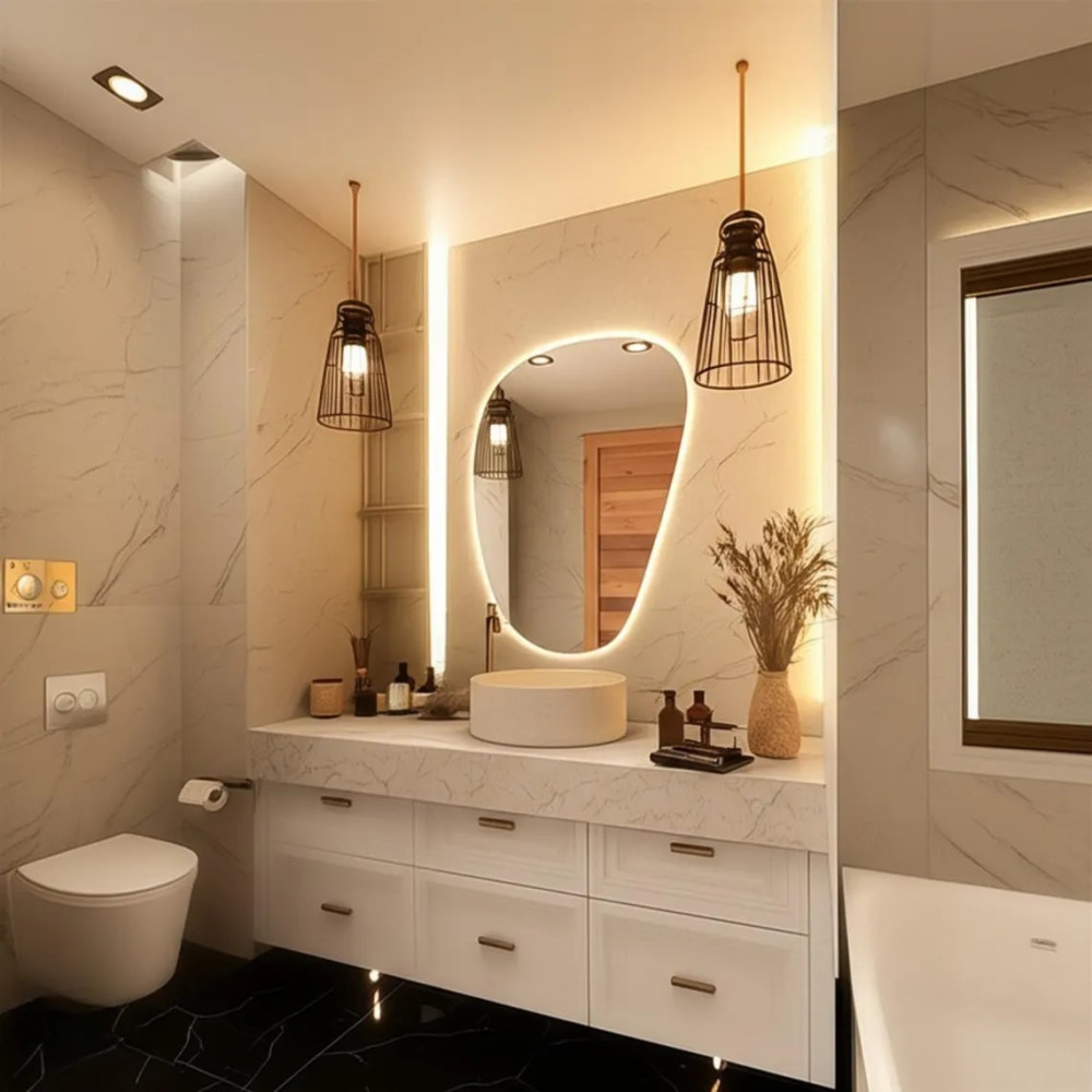 Зеркало Эден — стильное и современное решение, объединяющее мягкую пластику формы и атмосферное световое оформление. Его асимметричный силуэт создаёт визуальную динамику и делает интерьер более выразительным, а задняя фоновая LED-подсветка добавляет мягкое сияние и эффект парения на стене.