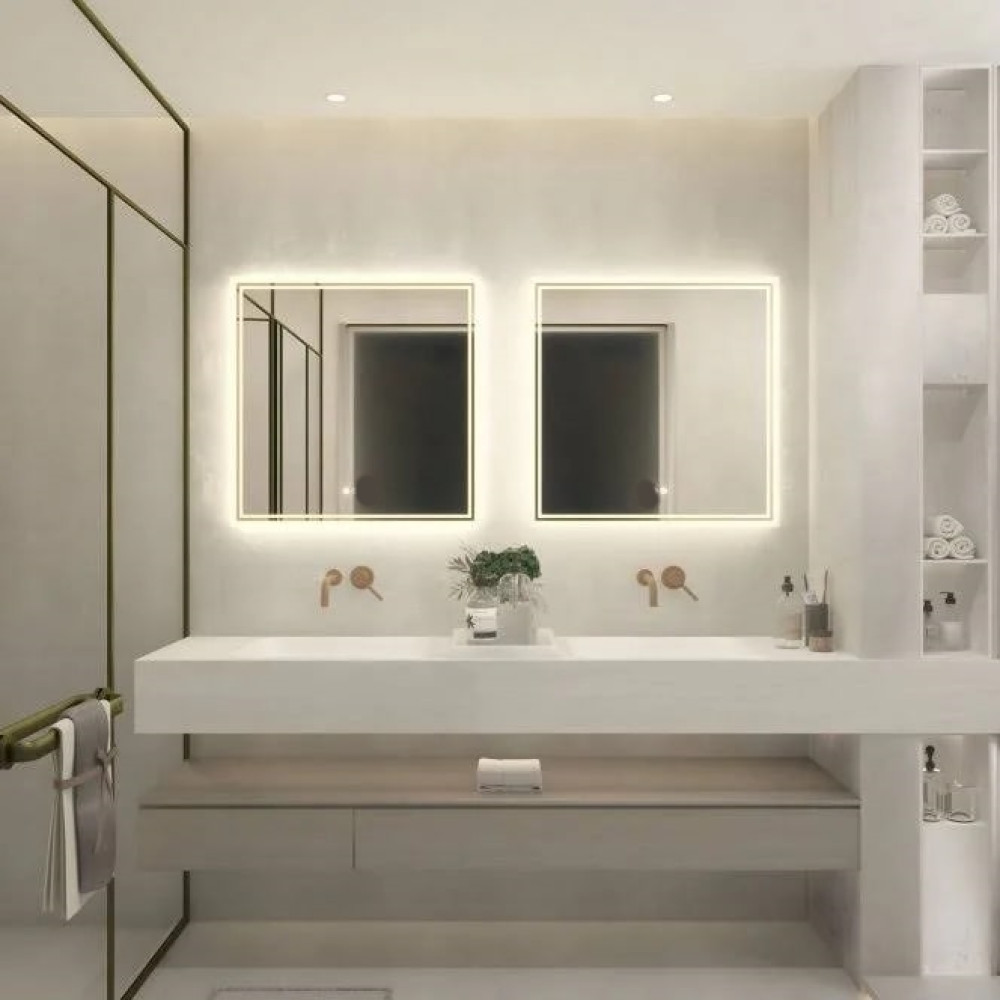 Задняя контурная подсветка создаёт мягкое сияние вокруг зеркала, добавляя интерьеру атмосферность и визуальную глубину.