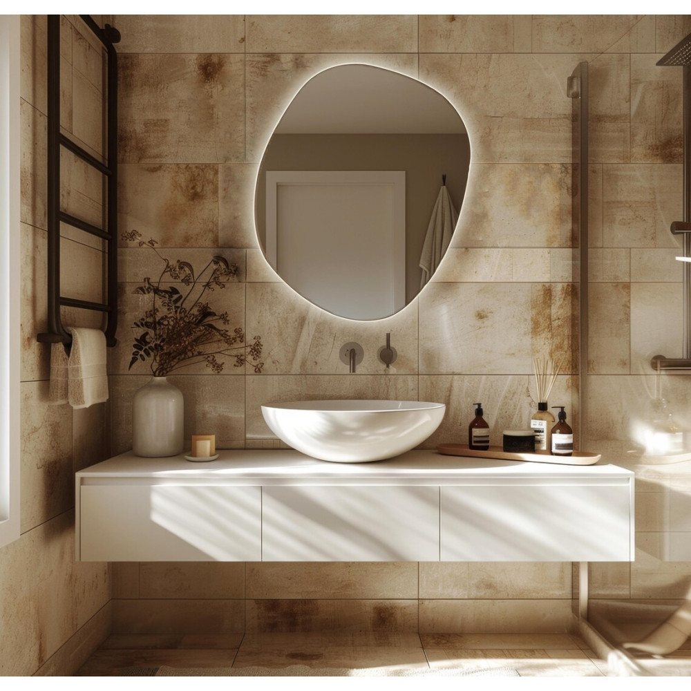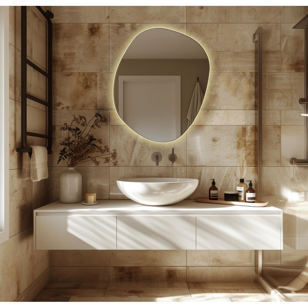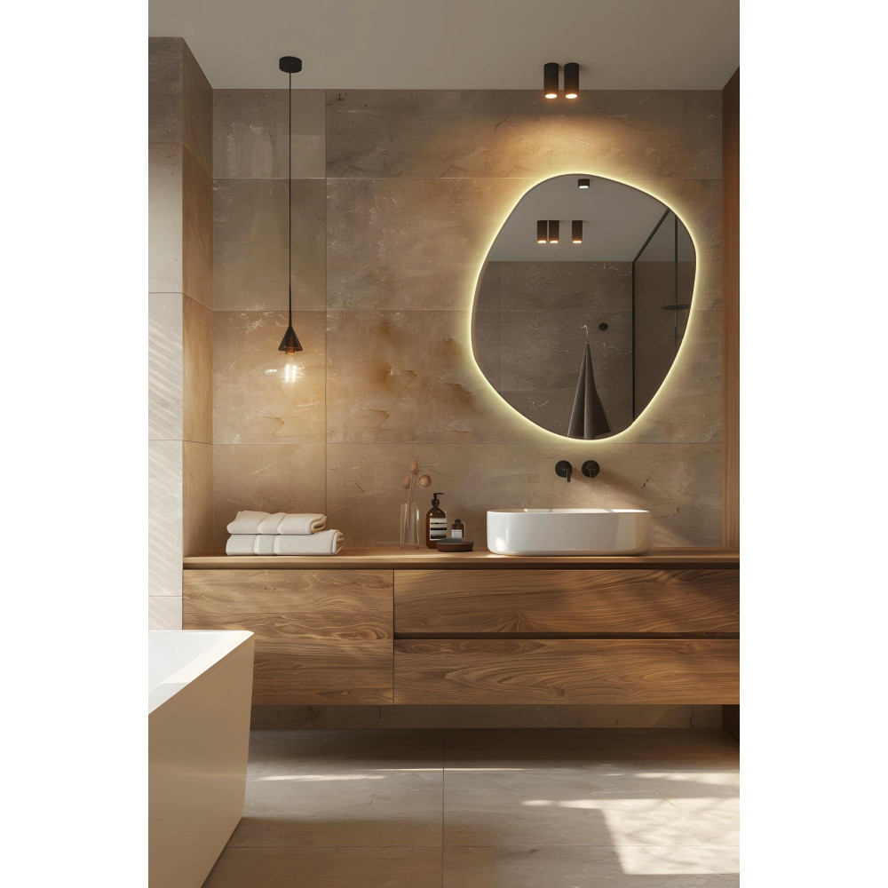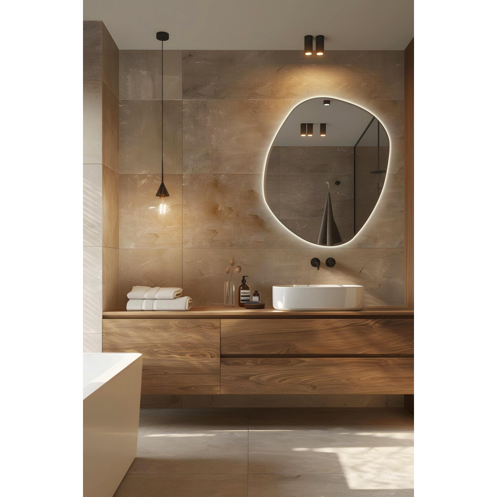 Зеркало Висбаден — стильное и оригинальное решение для современного интерьера. Его форма, напоминающая природный камень, придаёт пространству естественность и мягкость, а фоновая интерьерная светодиодная подсветка создаёт эффект парения и наполняет комнату уютным, рассеянным светом.