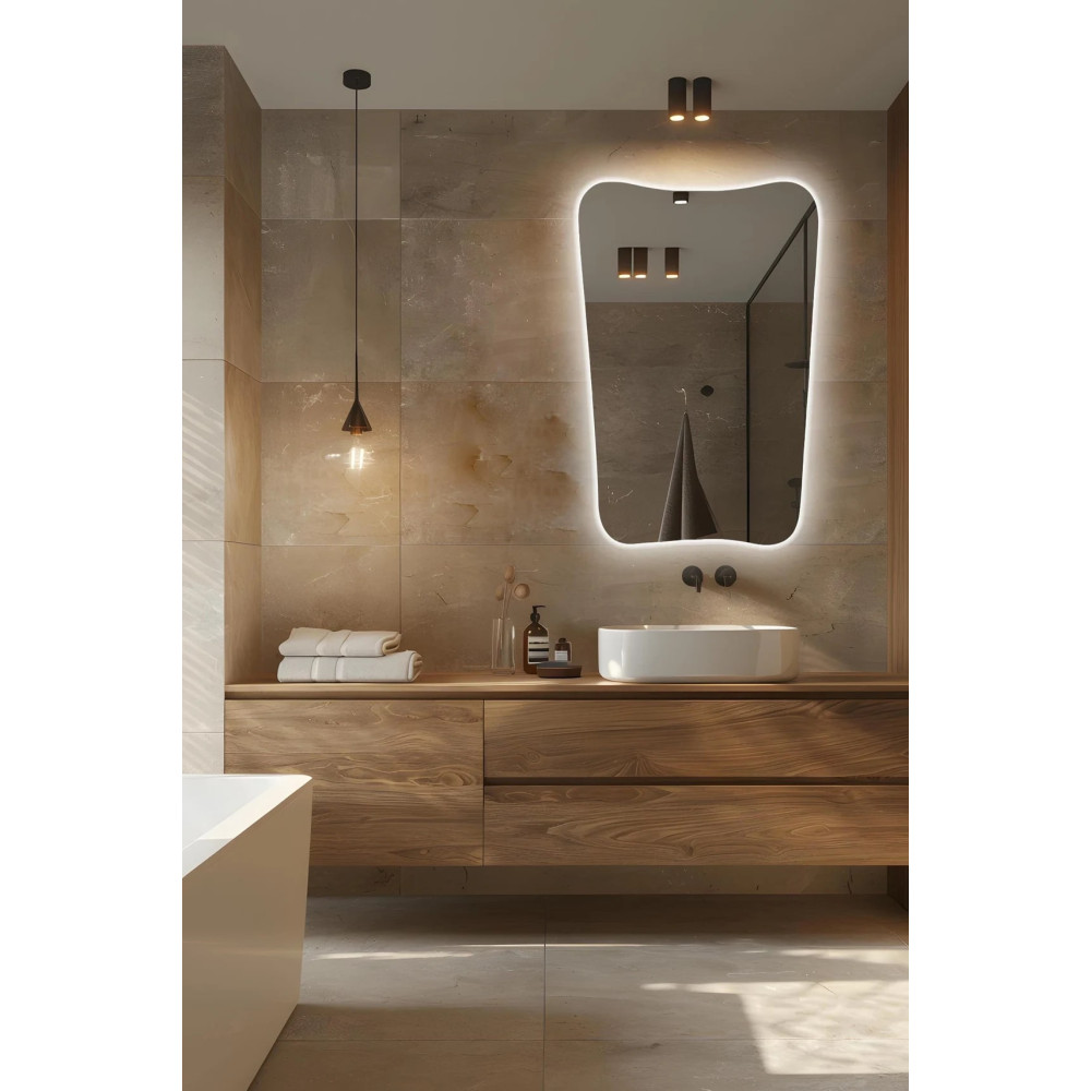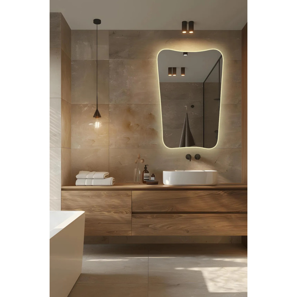 Задняя LED-подсветка даёт приятное рассеянное свечение, идеально подходящее для вечернего освещения, акцентных зон и создания расслабляющей атмосферы. Такое зеркало гармонично смотрится в спальне, гостиной, прихожей, ванной комнате, салонах или студиях.