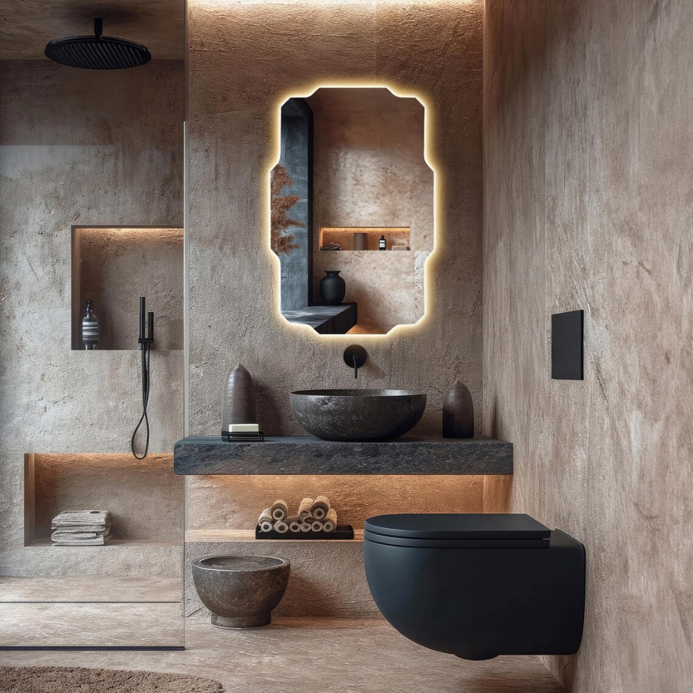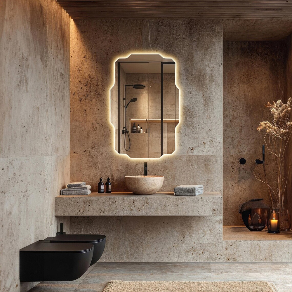 Фоновая светодиодная подсветка формирует мягкое свечение позади зеркала, добавляя глубину, атмосферность и эффект «парящего» света. Такое подсвечивание подчёркивает геометрию ар-деко и создаёт премиальный визуальный образ, гармонично дополняя современные и классические интерьеры.
