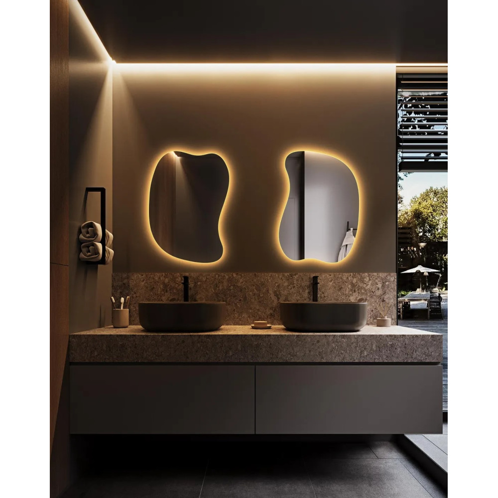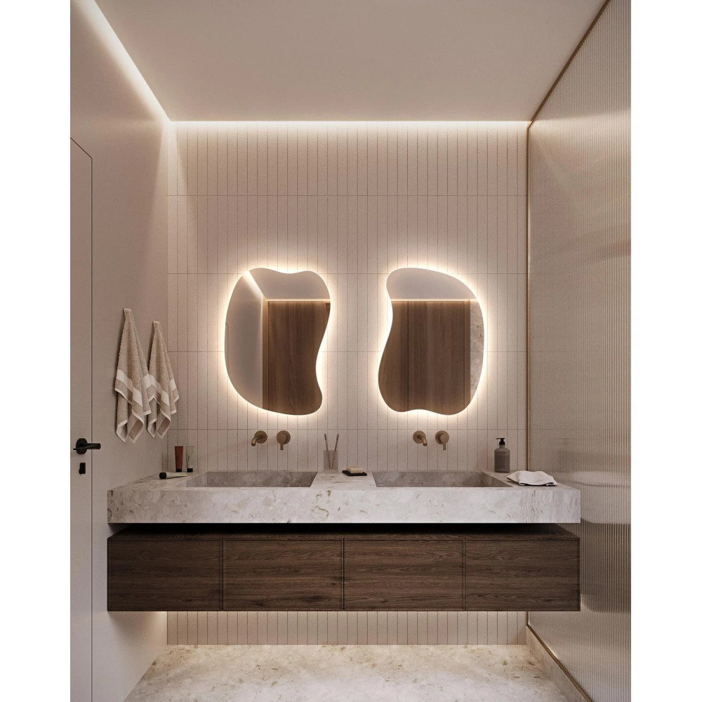 Задняя контурная LED-подсветка формирует мягкое сияние по периметру, визуально отделяя зеркало от стены и создавая эффект лёгкого «парения». Такой световой акцент добавляет помещению глубину, уют и современную эстетику — особенно в вечернем освещении.