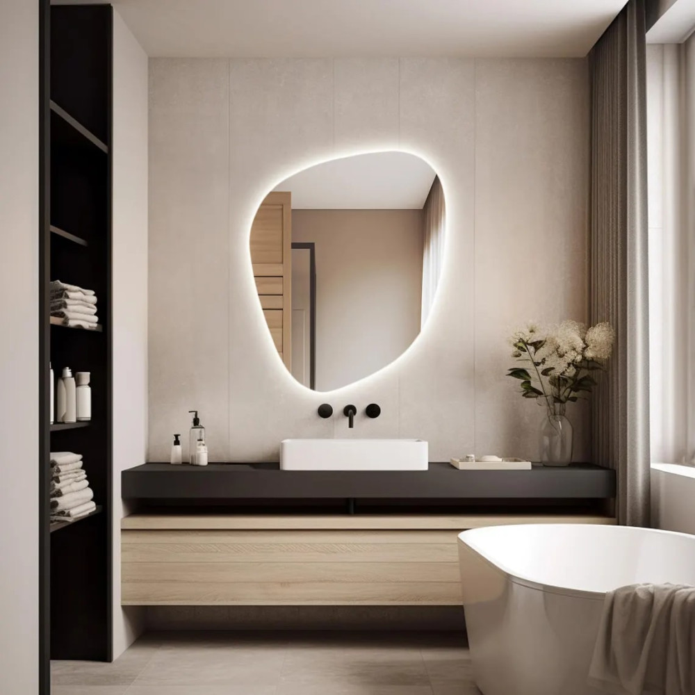Зеркало «Палермо 005» — дизайнерское асимметричное зеркало с парящей эмбилайт-подсветкой