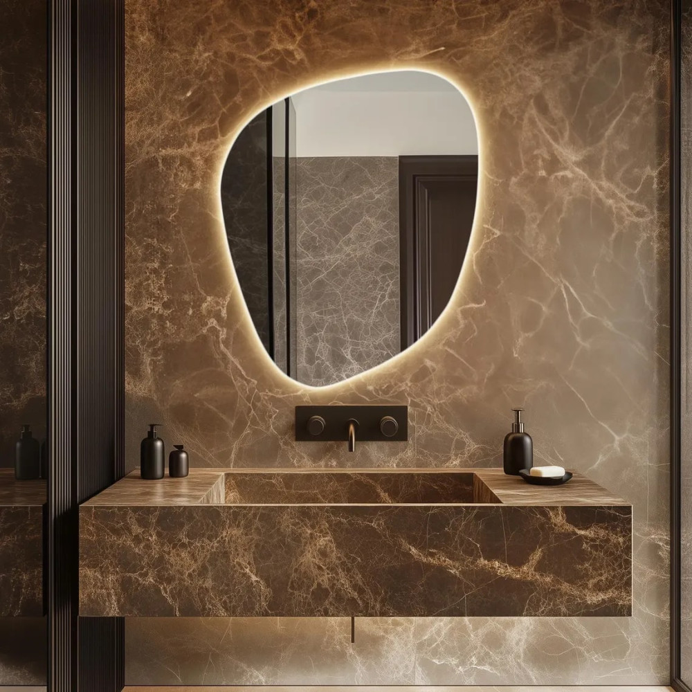 Зеркало «Палермо 005» — это эффектный интерьерный акцент, который сочетает уникальную асимметричную форму и современную “парящую” эмбилайт-подсветку. Благодаря мягкому световому ореолу зеркало будто отделяется от стены, создавая визуальный эффект левитации и добавляя пространству глубину и атмосферность.