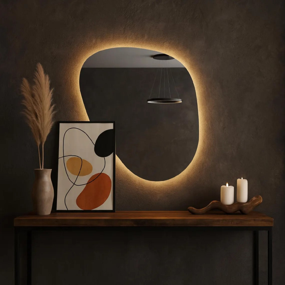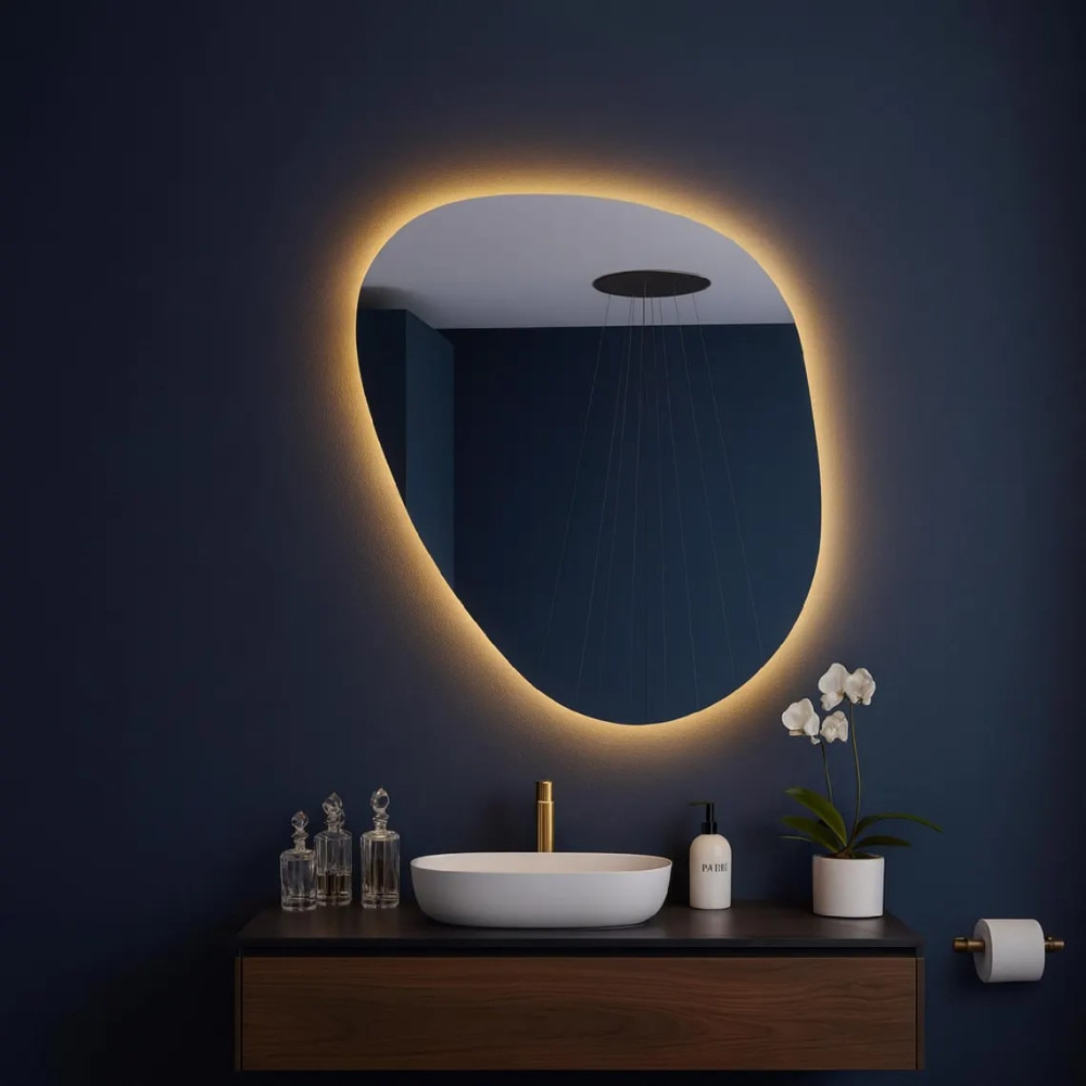 Задняя LED-подсветка создаёт мягкое сияние вокруг зеркала, визуально отделяя его от стены и формируя эффект лёгкого «парения». Такое рассеянное свечение добавляет пространству глубину, уют и современную атмосферность — идеально для акцентных стен и вечернего освещения.