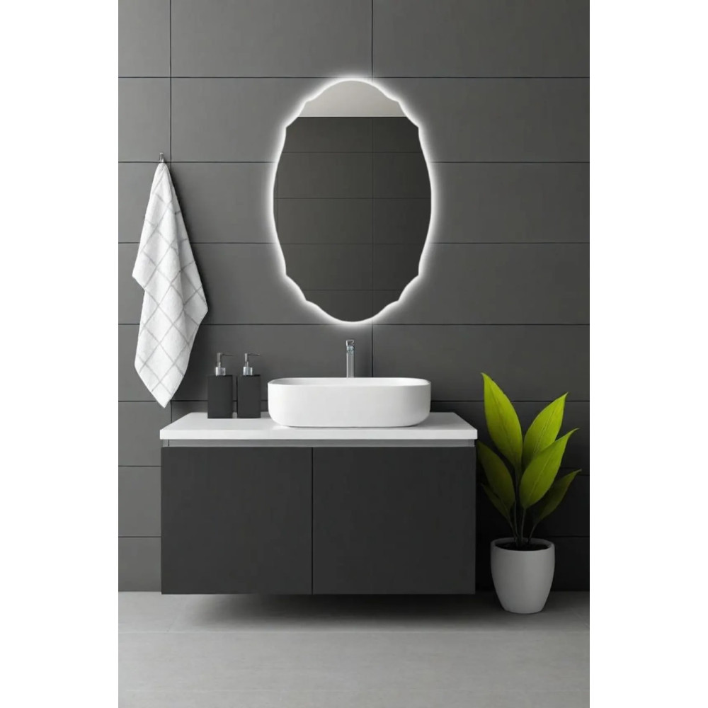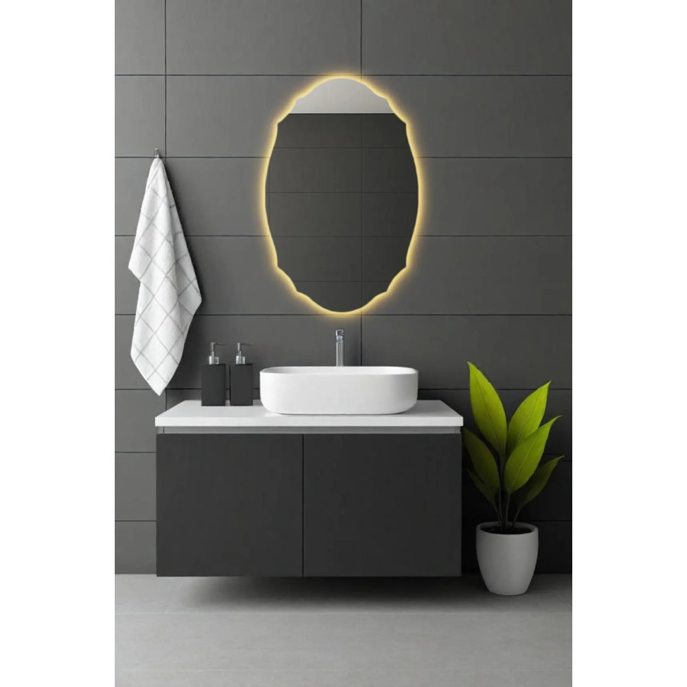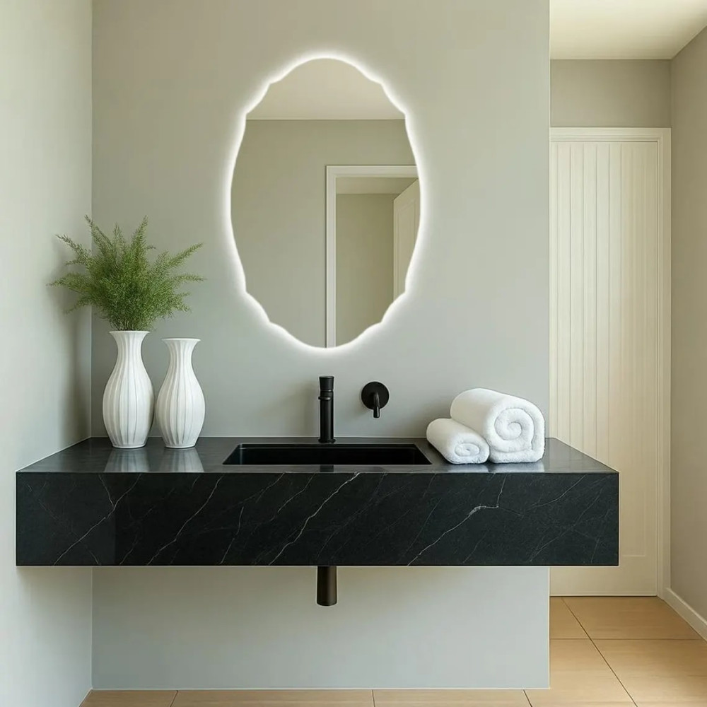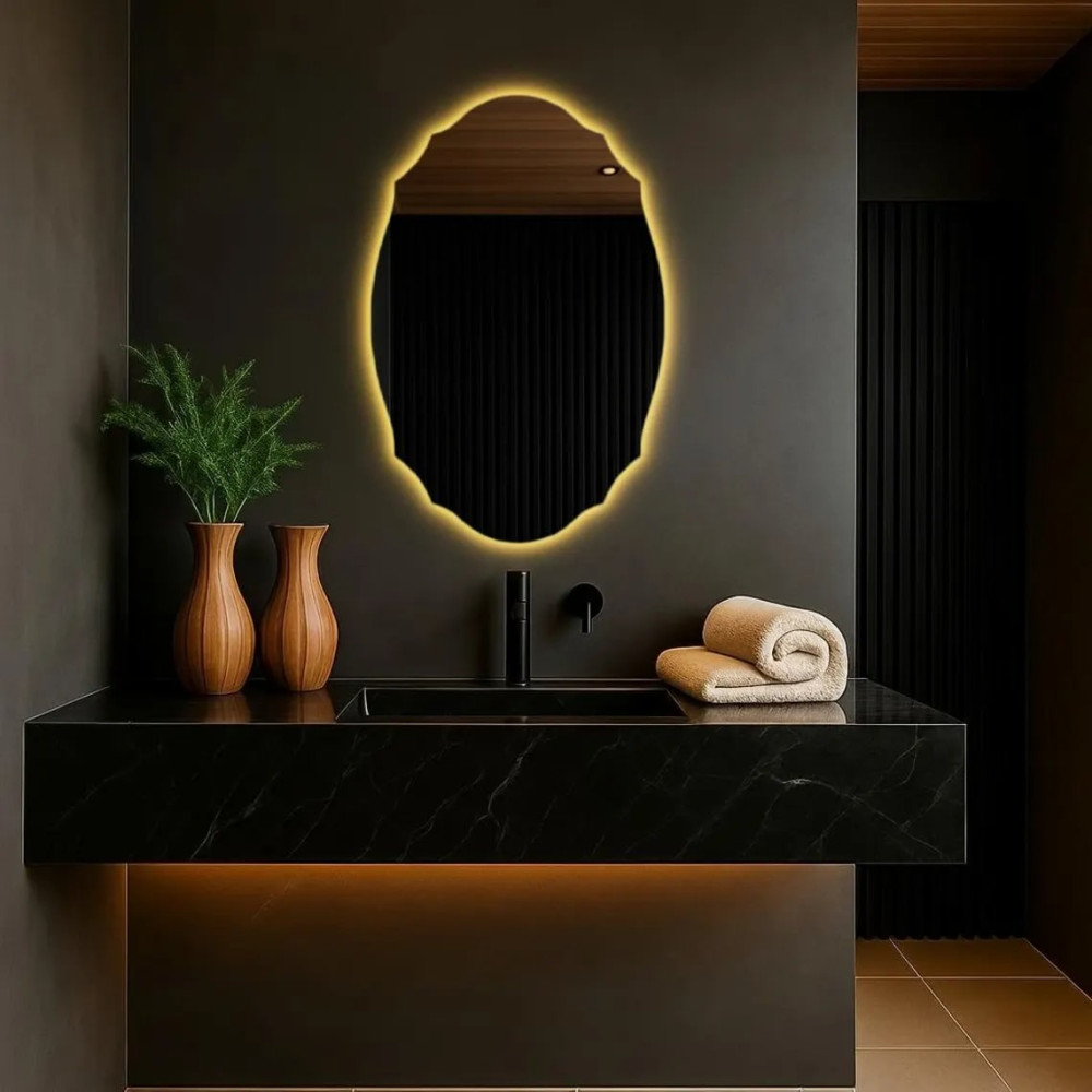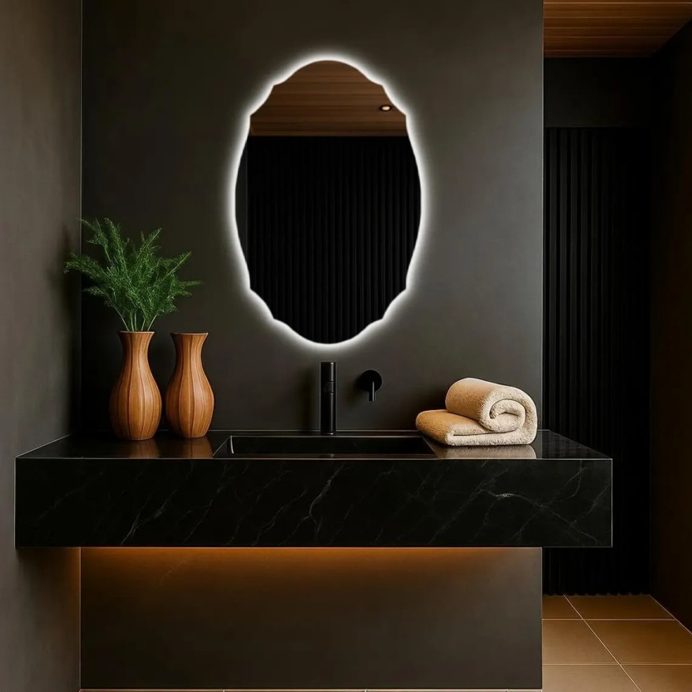 Встроенная подсветка добавляет зеркалу мягкое свечение, подчёркивая его форму и визуально отделяя его от стены. Благодаря такому световому эффекту пространство становится более глубоким, атмосферным и уютным — идеально для акцентных зон и вечернего освещения.