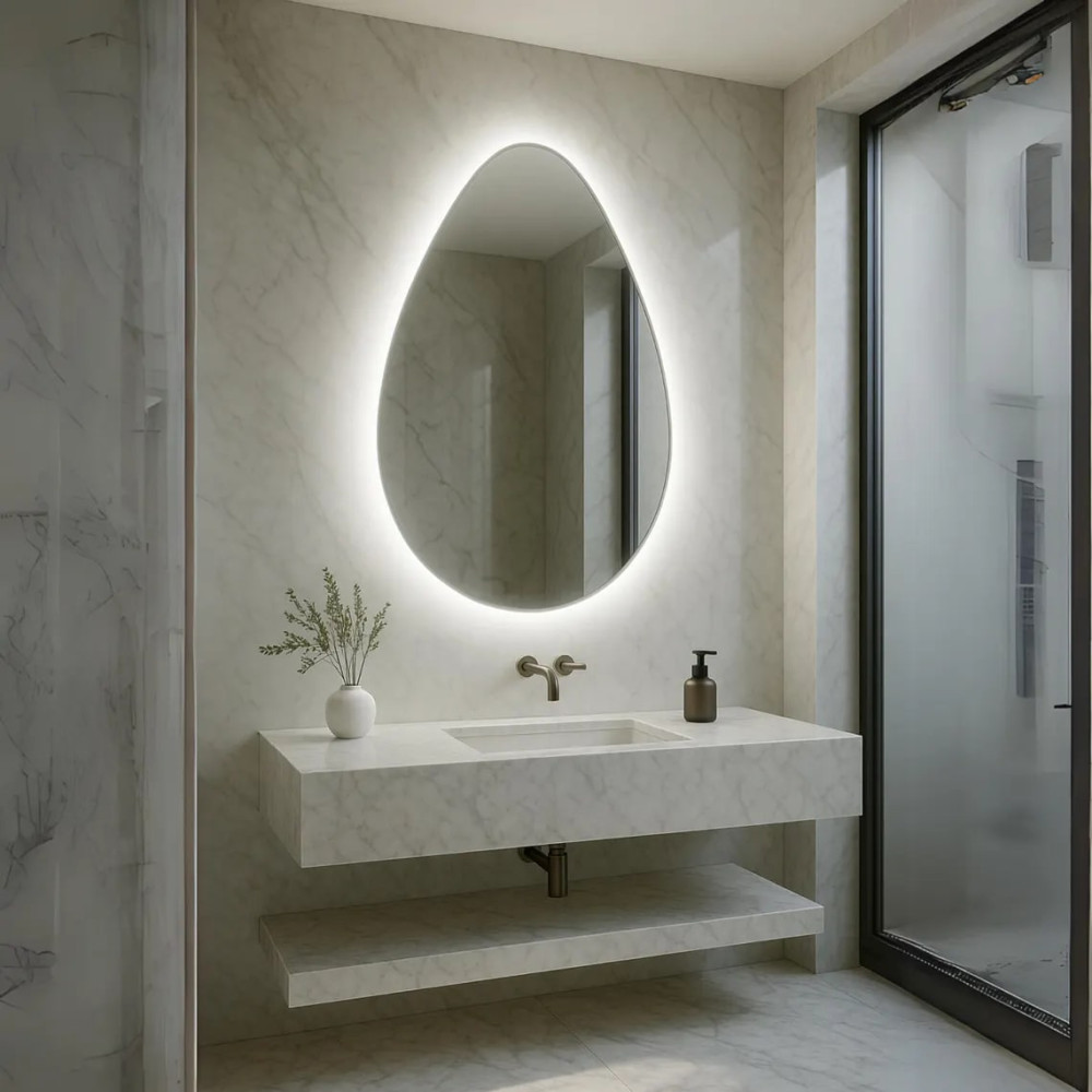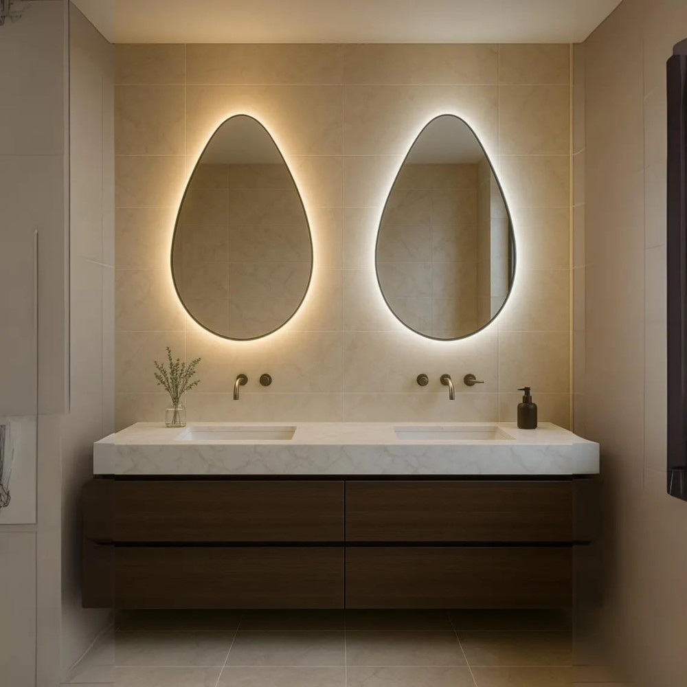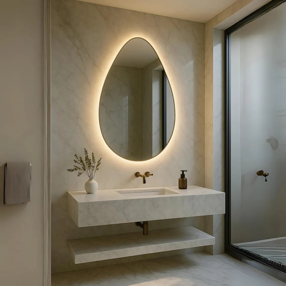 Задняя фоновая LED-подсветка создаёт мягкое рассеянное свечение вокруг зеркала, подчёркивая форму капли и формируя эффект лёгкого «парения» над стеной. Такой свет добавляет пространству глубину, уют и атмосферность, особенно эффектно проявляясь в вечернем освещении.