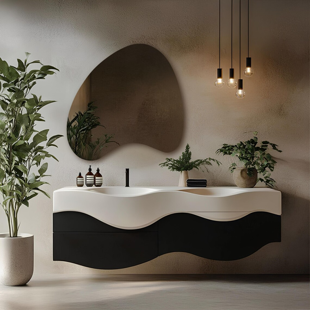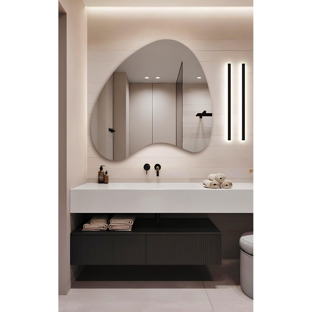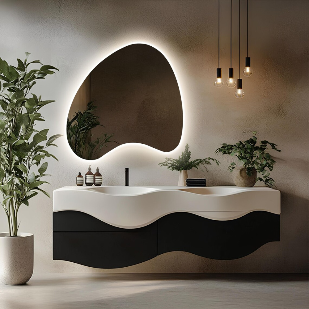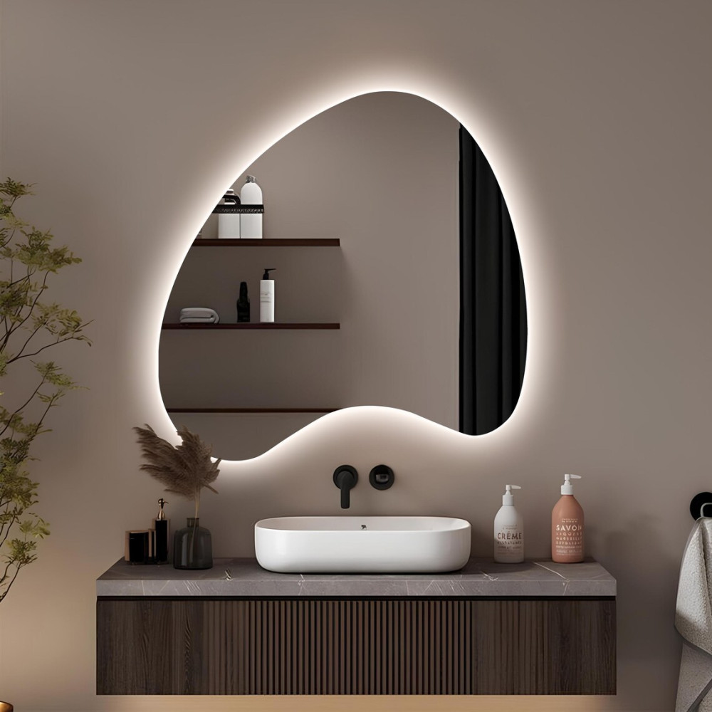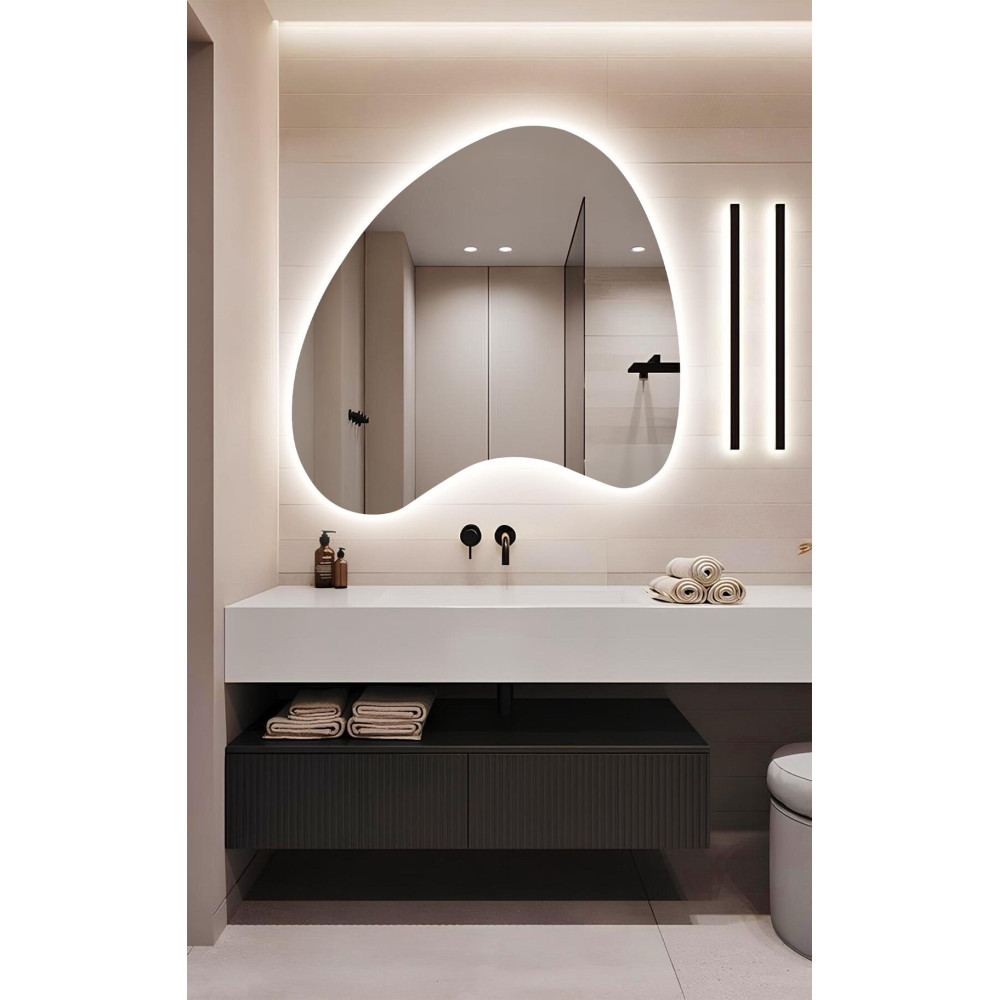 Встроенная светодиодная подсветка создаёт мягкое равномерное свечение по контуру, подчёркивая необычную форму и визуально отделяя зеркало от стены. Такой эффект «парящего» света делает интерьер более глубоким, уютным и современным.