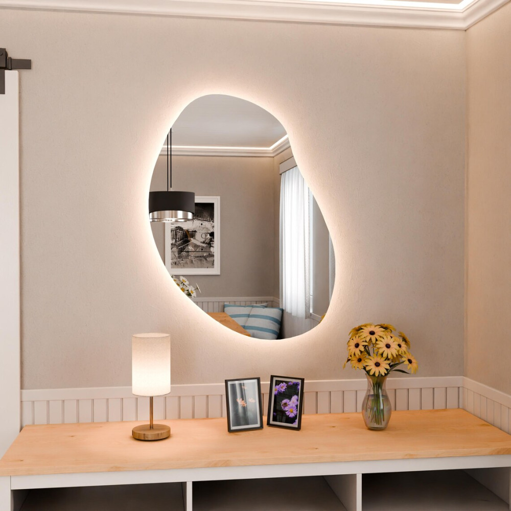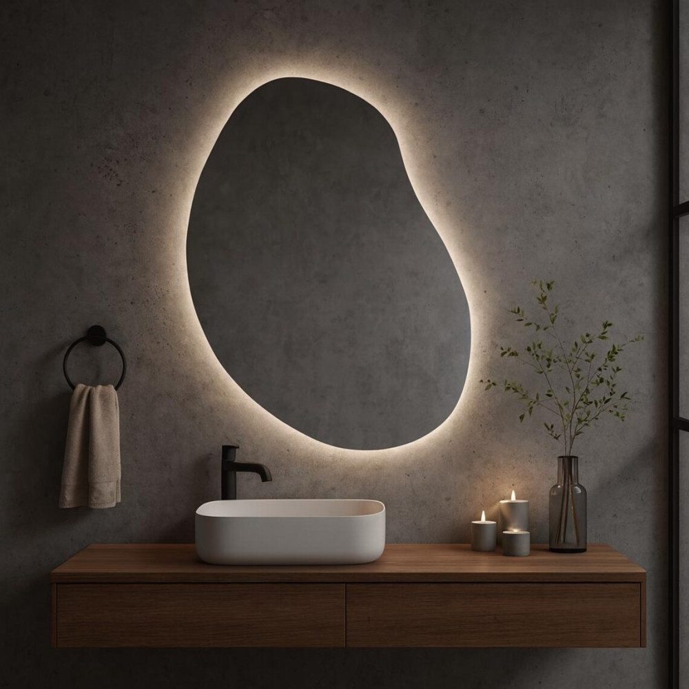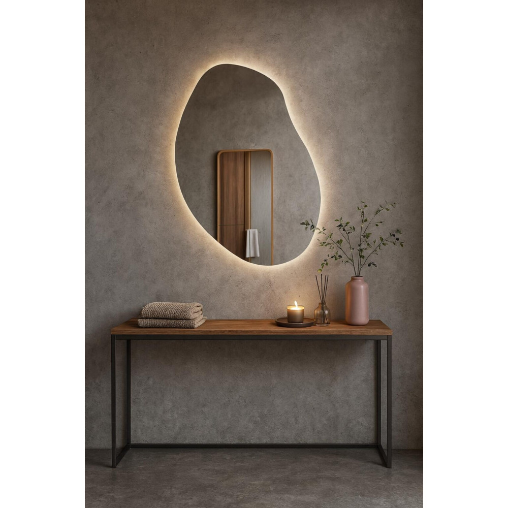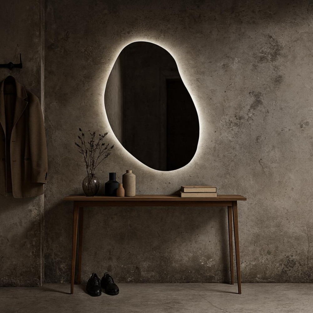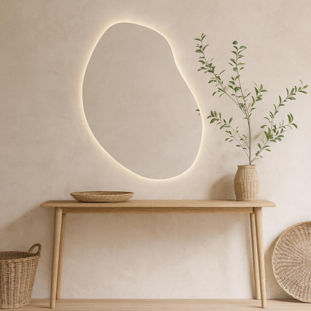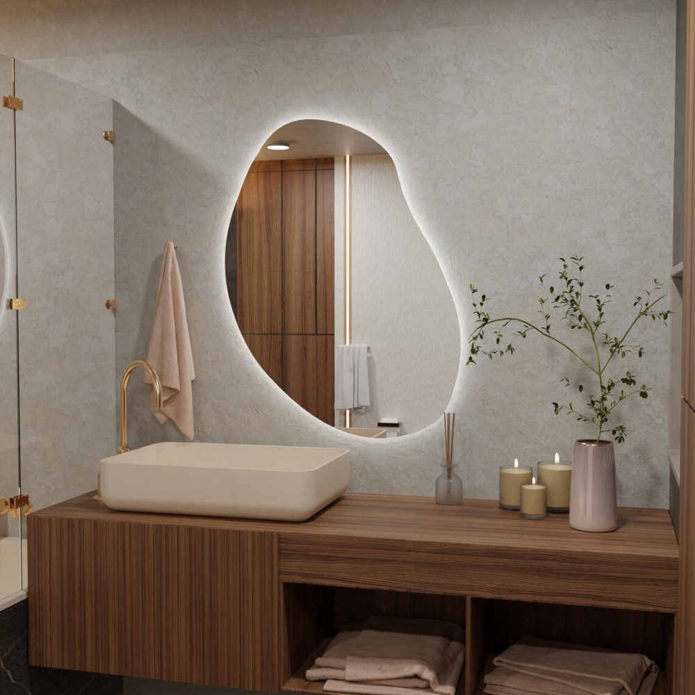 Встроенная светодиодная подсветка формирует мягкое свечение по периметру, подчеркнутое природными изгибами формы. Такой световой контур визуально отделяет зеркало от стены, создаёт эффект «парящего» объекта и добавляет пространству глубину и атмосферность.