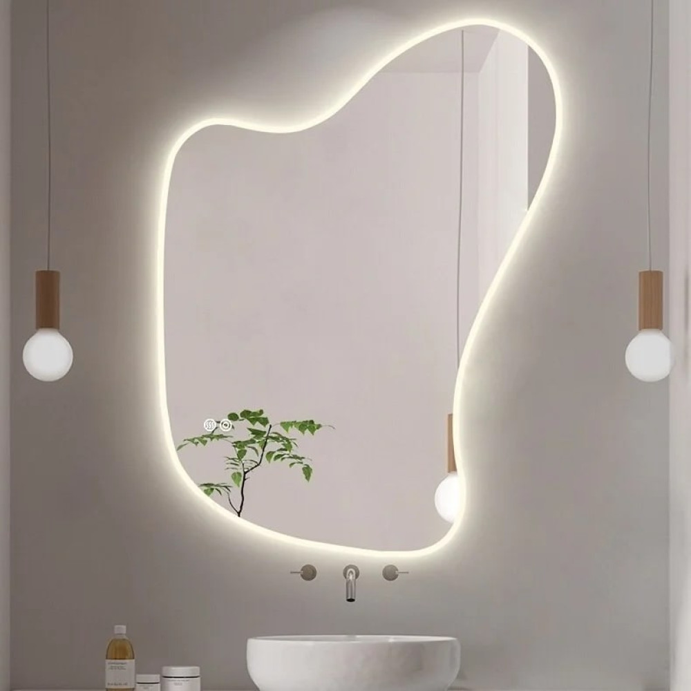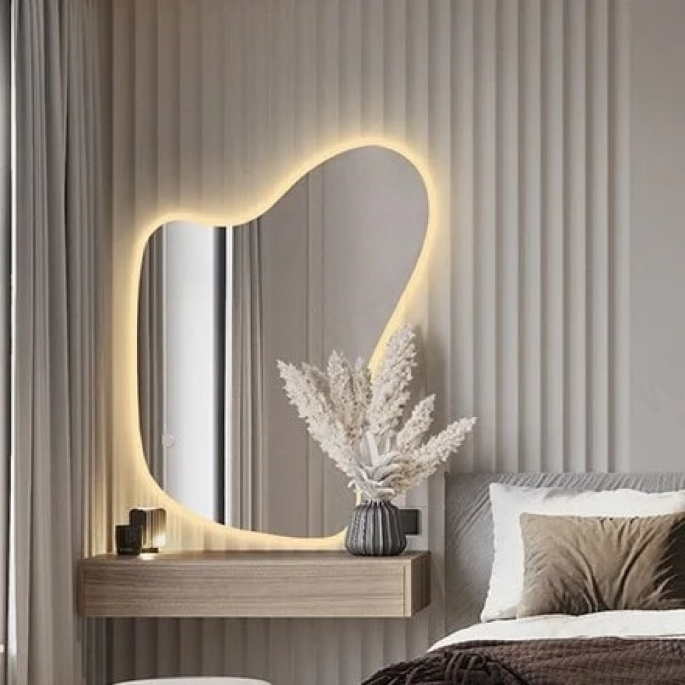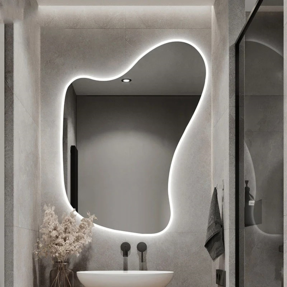 Современное зеркало необычной формы станет стильным акцентом в вашем интерьере. Благодаря тыльной LED-подсветке оно создаёт мягкое рассеянное свечение, добавляя помещению уюта и визуально расширяя пространство.