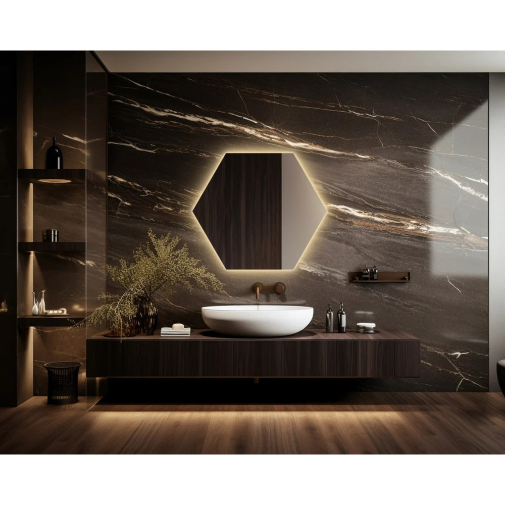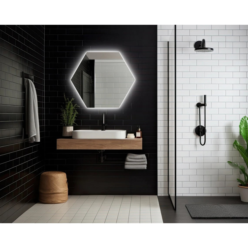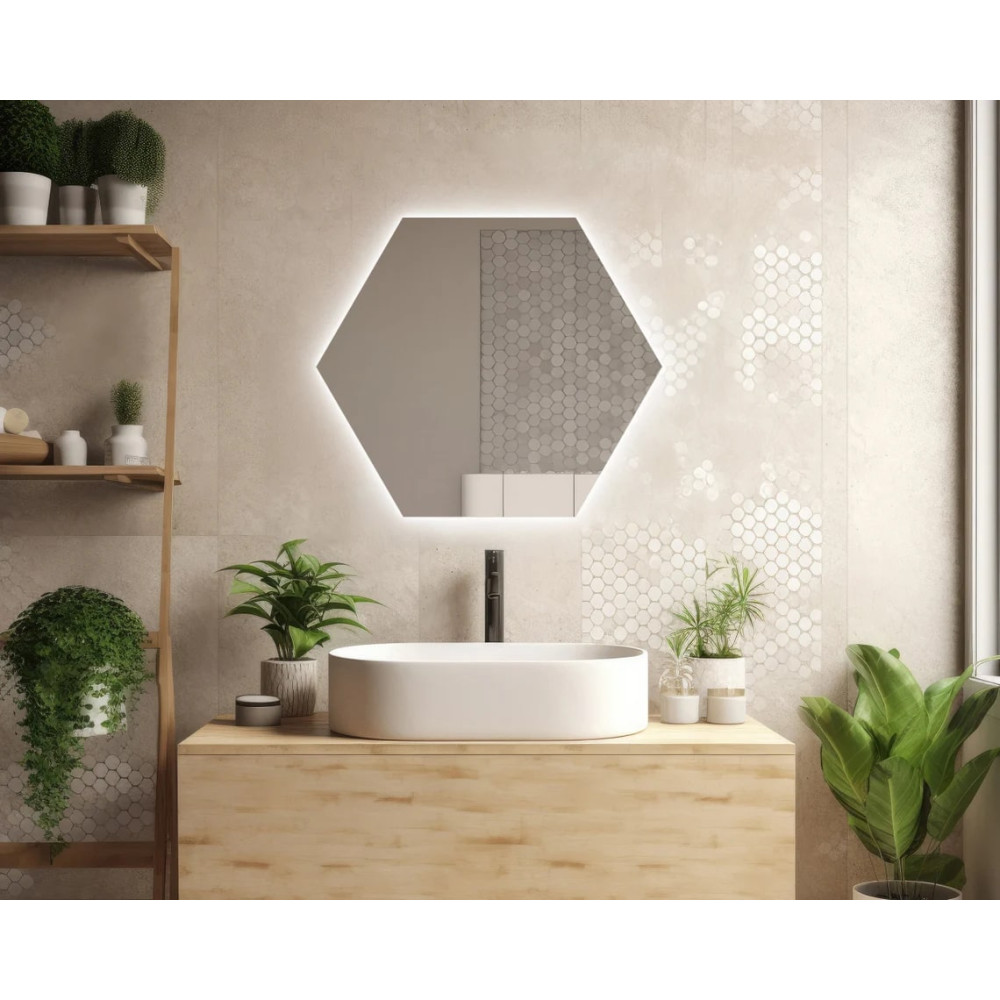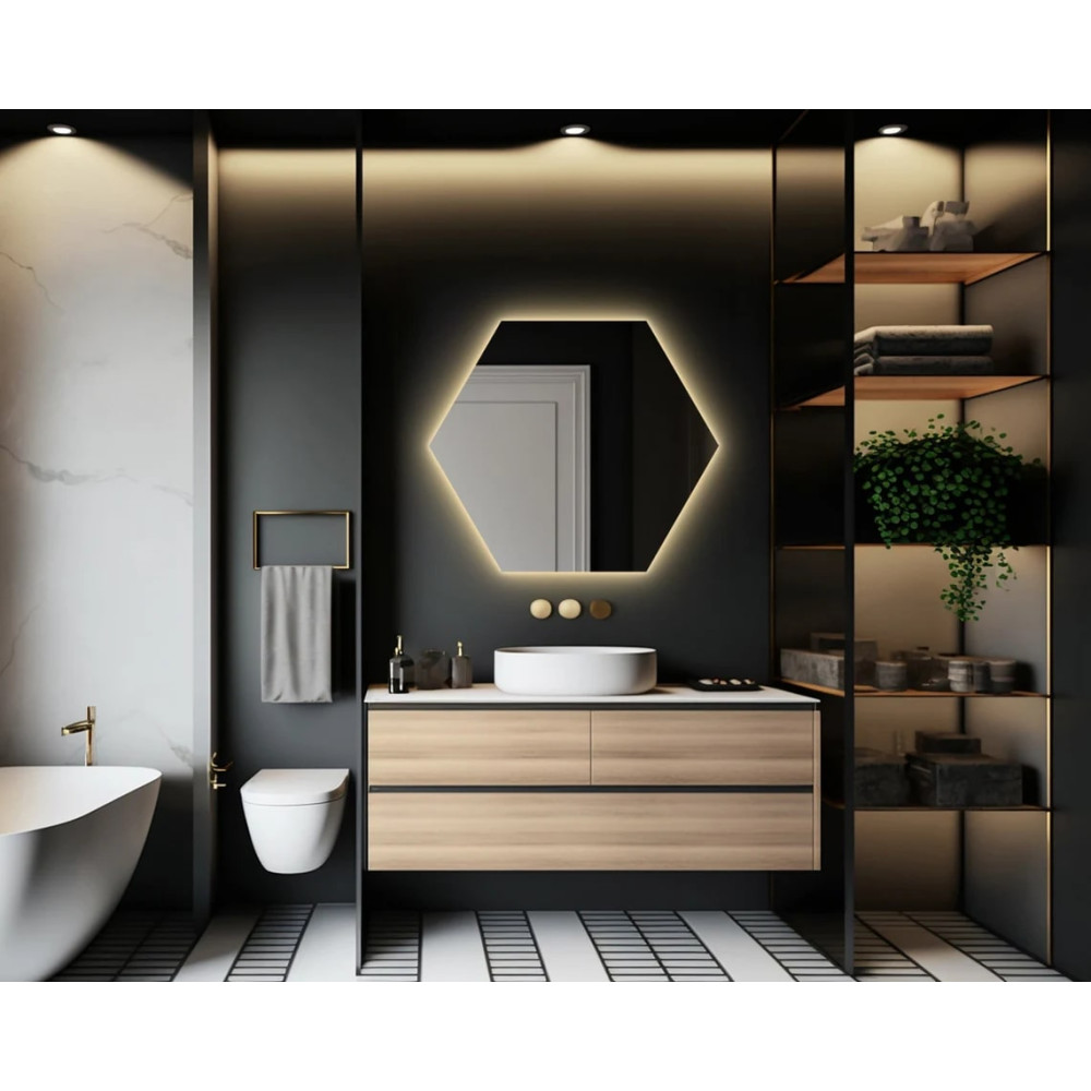 Влагостойкое зеркало с фоновой эмбилайт подсветкой «Гексагон».
