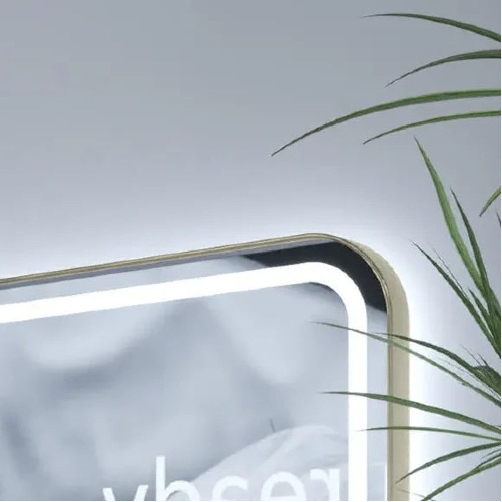 Широкое большое зеркало с подсветкой в тонкой золотой металлической раме с закруглёнными углами Тренд 004