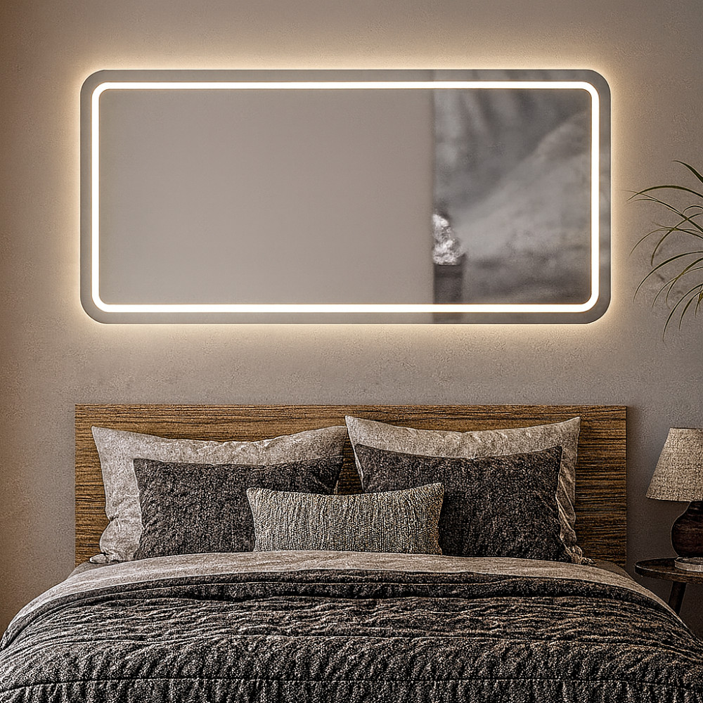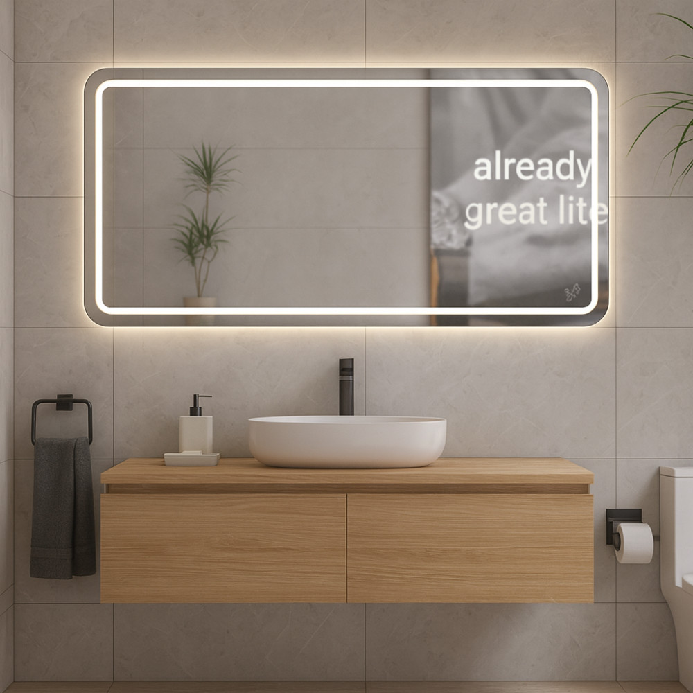 Современное широкое зеркало в лаконичной форме с закруглёнными углами станет стильным и функциональным элементом интерьера. Встроенная LED-подсветка обеспечивает яркое и равномерное освещение, создавая комфортные условия для ухода за собой и визуально расширяя пространство.