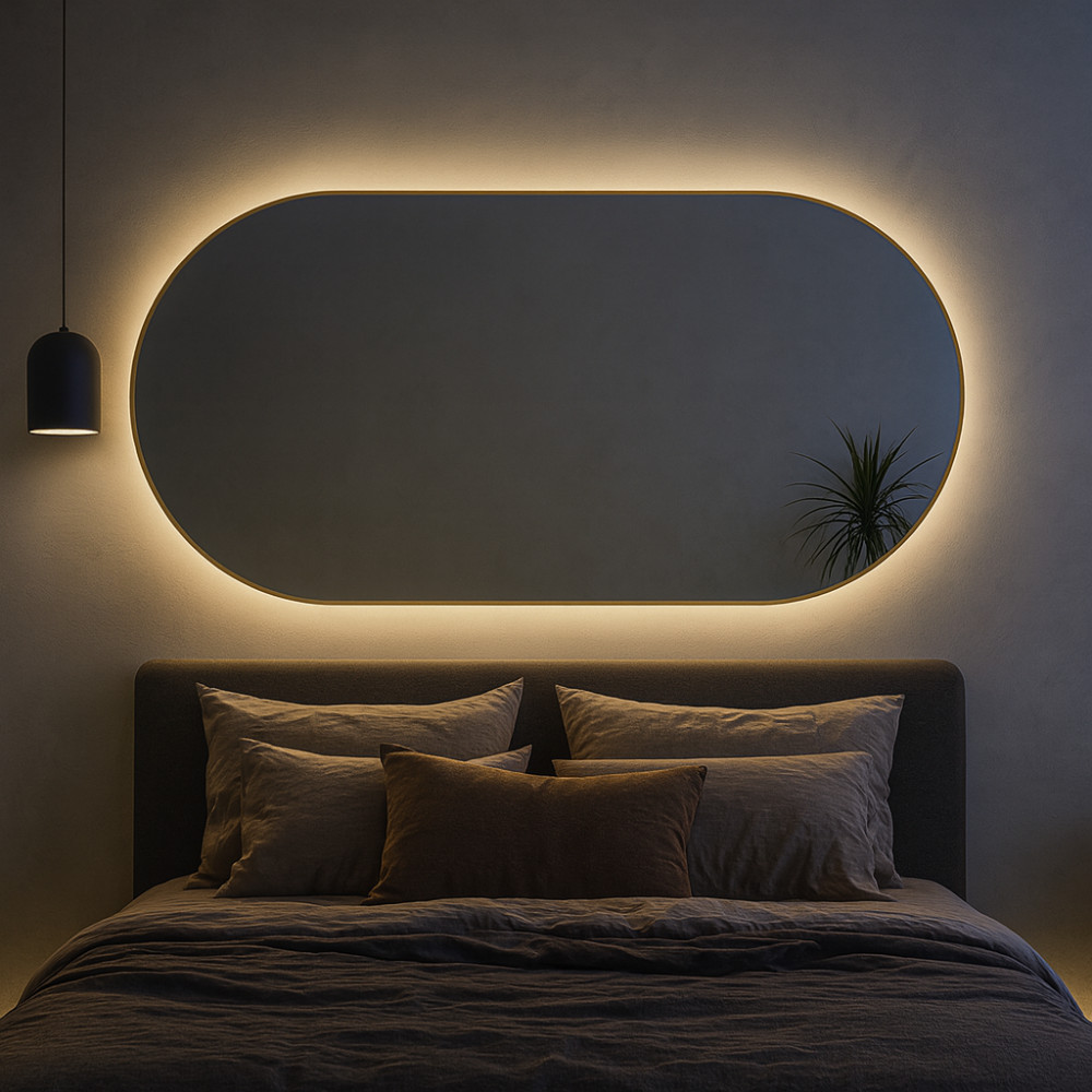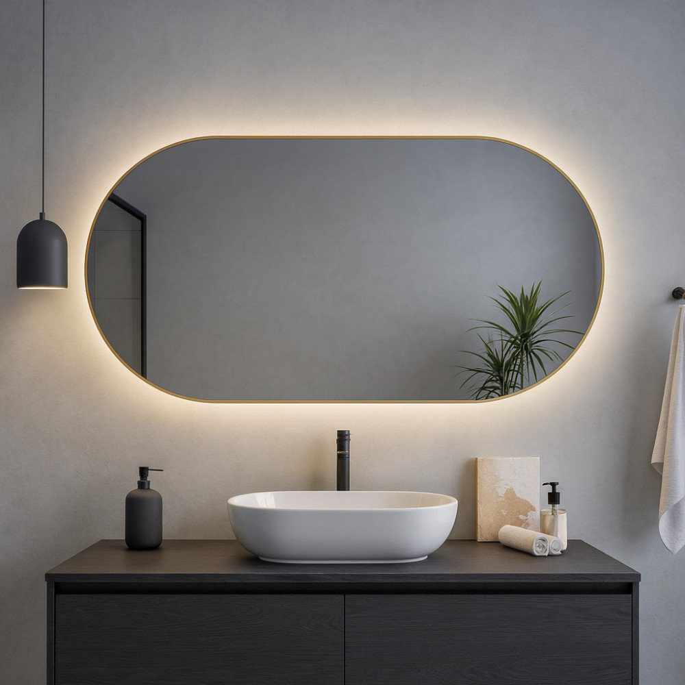 Элегантное широкое зеркало в изысканной золотой раме станет стильным украшением интерьера и добавит пространству лёгкости и уюта. Мягкая тыльная LED-подсветка создаёт эффект «парящего зеркала» и атмосферное декоративное свечение.