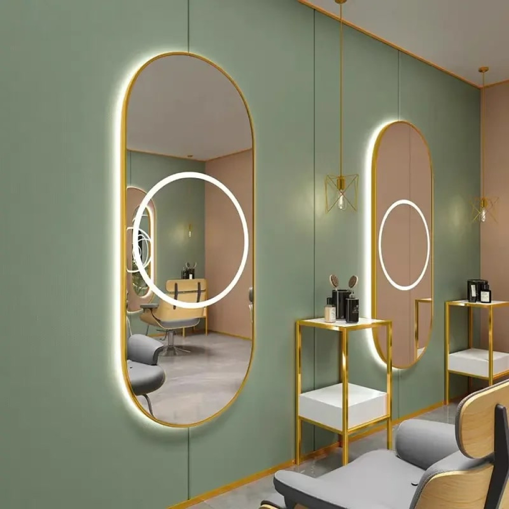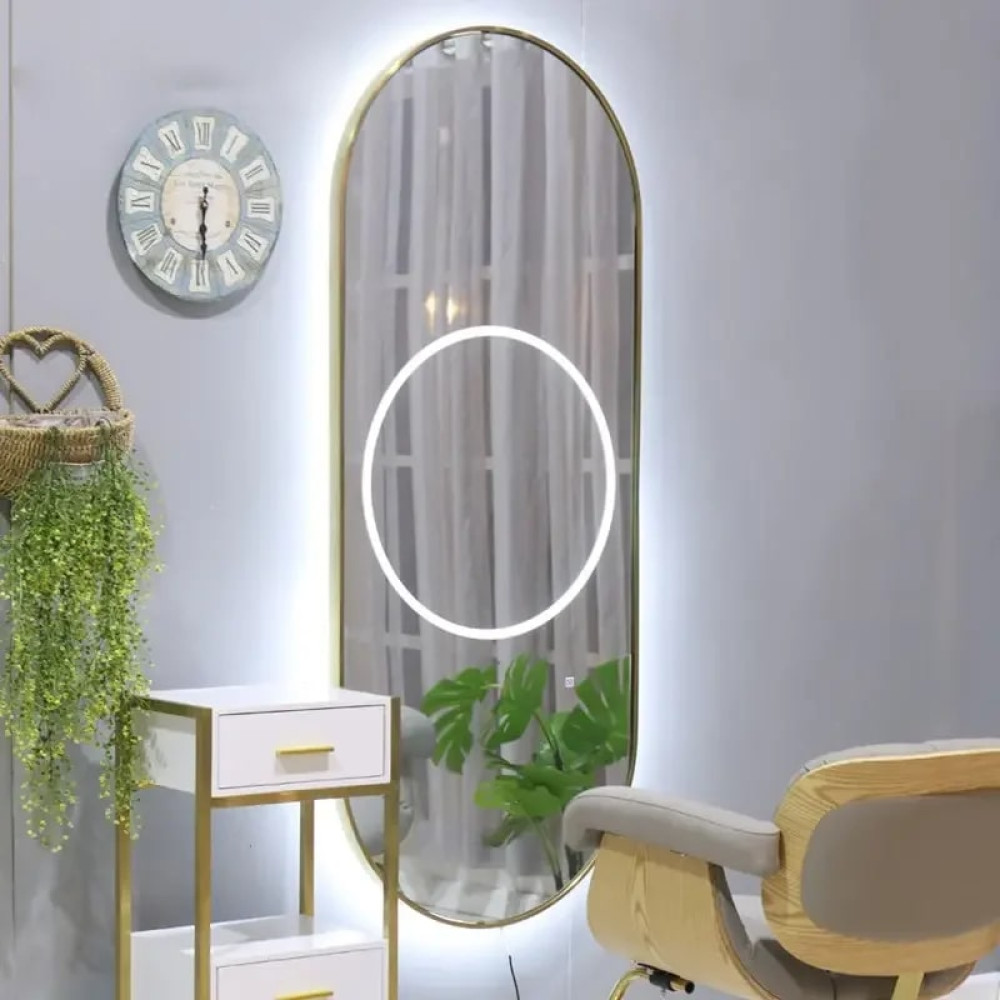 Большое зеркало капсульной формы в полный рост с передней и тыльной фоновой подсветкой в тонкой золотой металлической раме «Тренд 007»
