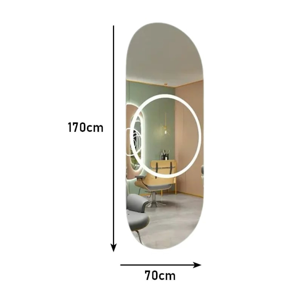 Эффектное зеркало-капсула в полный рост сочетает изысканный дизайн и функциональность. Двойная подсветка — фронтальная и задняя декоративная — обеспечивает яркое рабочее освещение и мягкое свечение по контуру, создающее атмосферу уюта и эффект «парящего» зеркала.