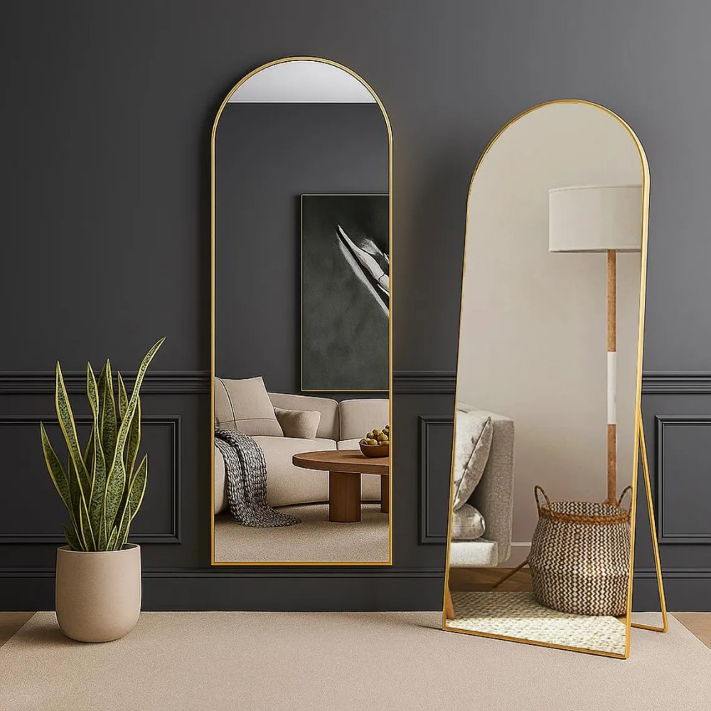 Золотая рама из качественного МДФ добавляет изделию роскоши и утончённости, гармонично вписываясь в классические, современные и арт-деко интерьеры. Встроенная опора-ножка позволяет удобно разместить зеркало в любом месте комнаты без необходимости крепления к стене — идеальный вариант для гардеробных, спален, студий и салонов красоты.