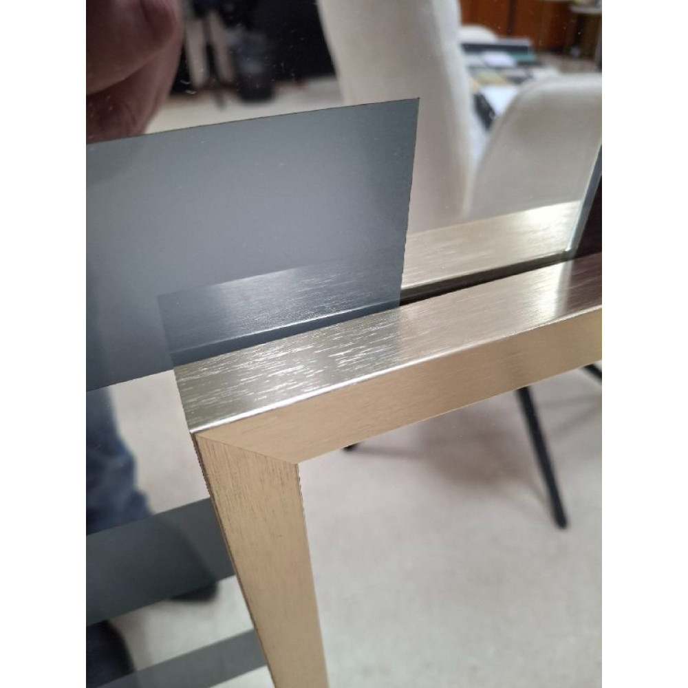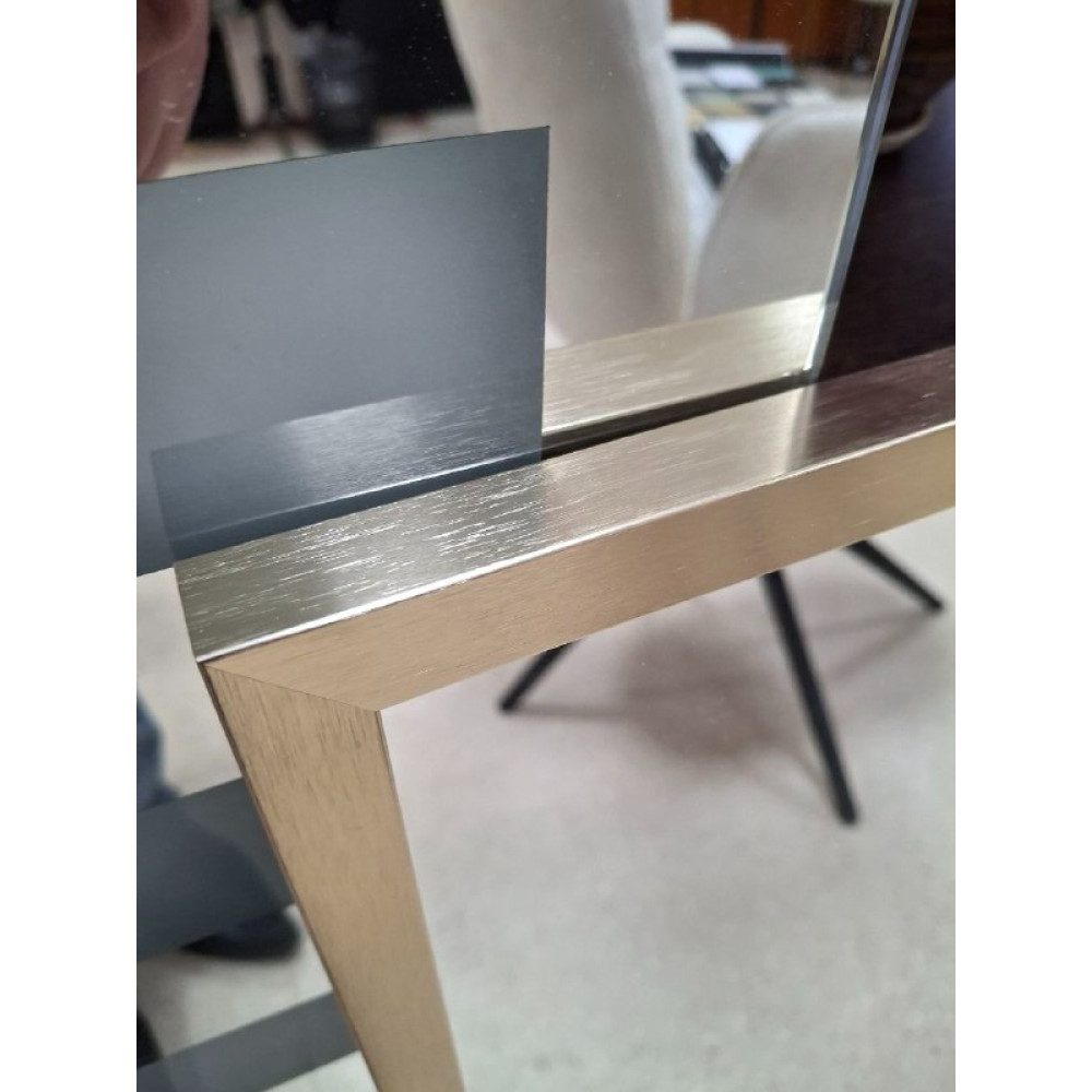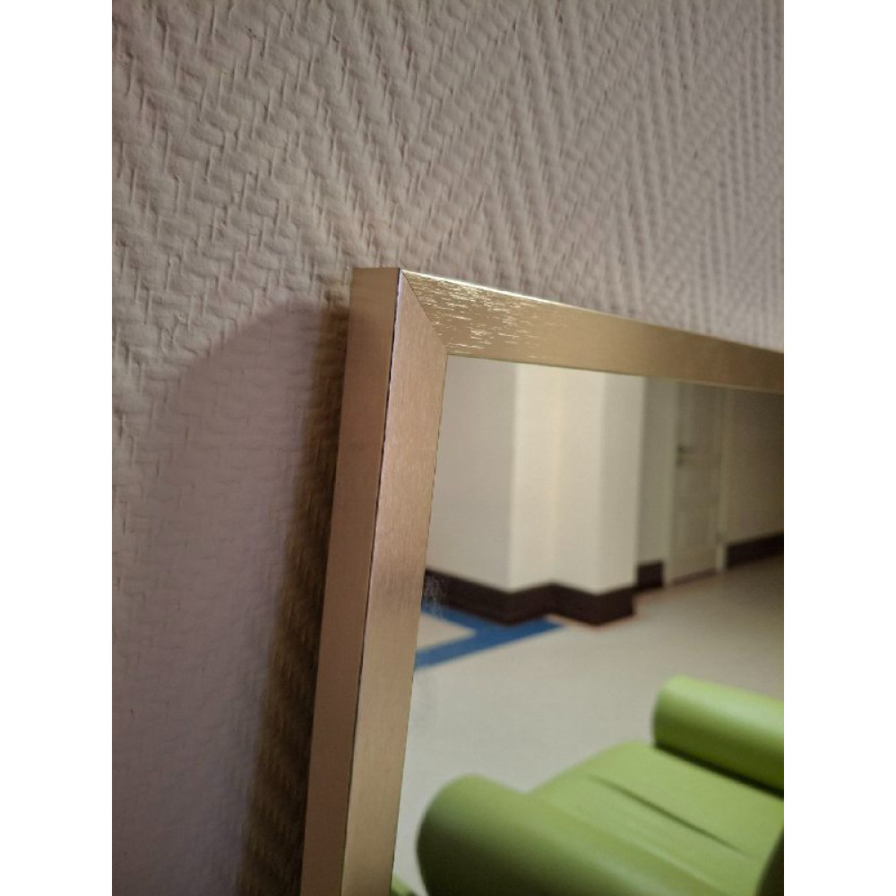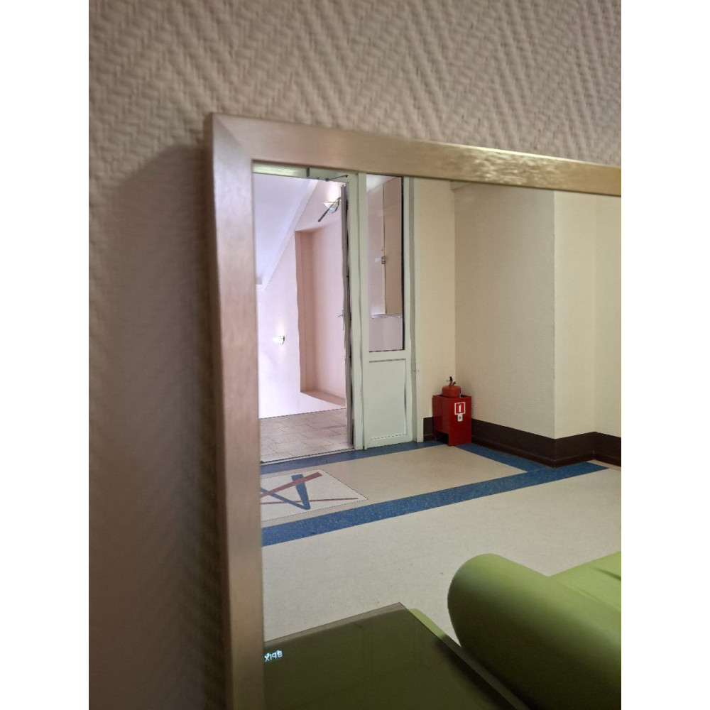 Прямоугольная форма делает модель универсальной и практичной, а металлическая рама аккуратно обрамляет зеркало, создавая чёткий, завершённый силуэт. Брашированная поверхность с глянцевым эффектом красиво отражает свет и добавляет интерьеру глубину и визуальную динамику.