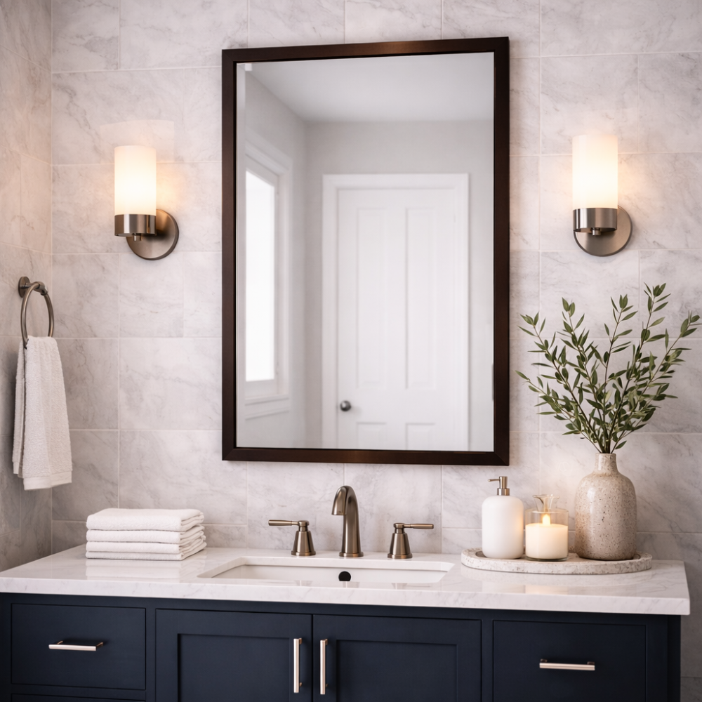 Прочная рама из алюминия — устойчива к коррозии, не деформируется со временем, обеспечивает надёжную фиксацию зеркала.