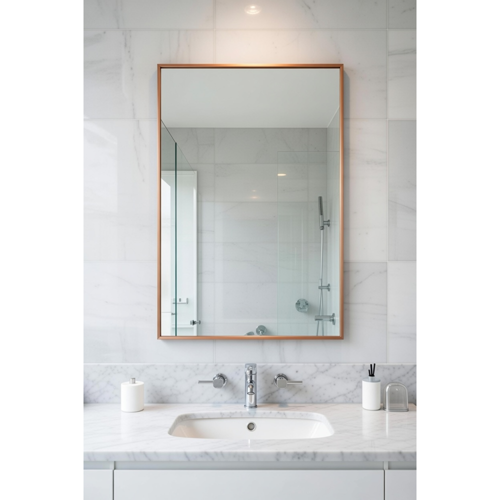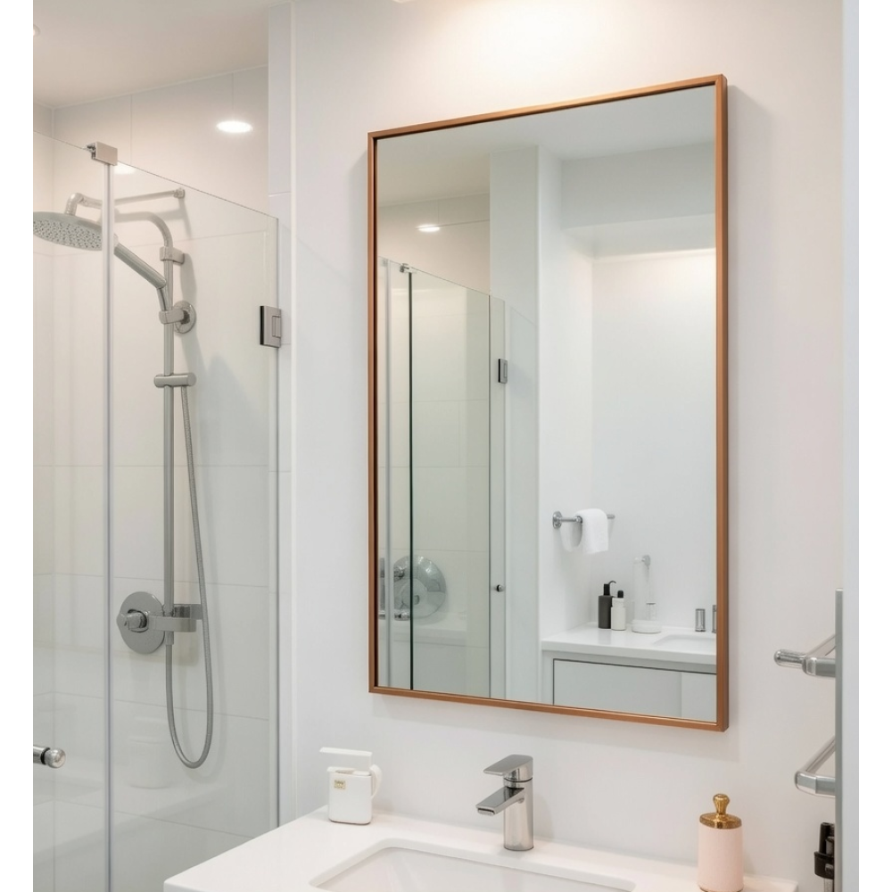 Премиальные материалы: Тонкая и прочная рама выполнена из высококачественного алюминия. Она устойчива к коррозии, влаге и механическим повреждениям, что делает зеркало идеальным выбором даже для ванных комнат.