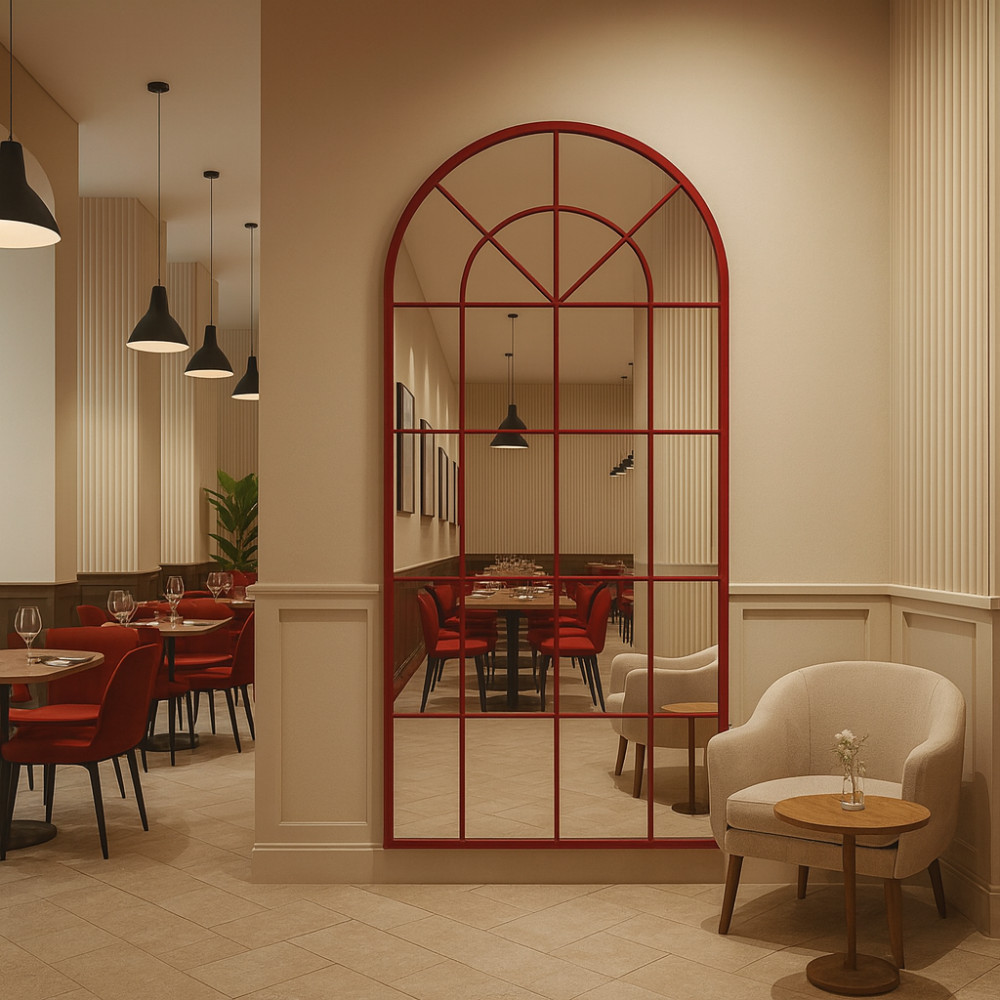 Насыщенная красная рама создаёт выразительный акцент и подчёркивает характер интерьера — от современного и арт-деко до лофта и эклектики. Такой дизайн идеально подойдёт для смелых проектов, салонов, бутиков, фотостудий и стильных жилых пространств.
