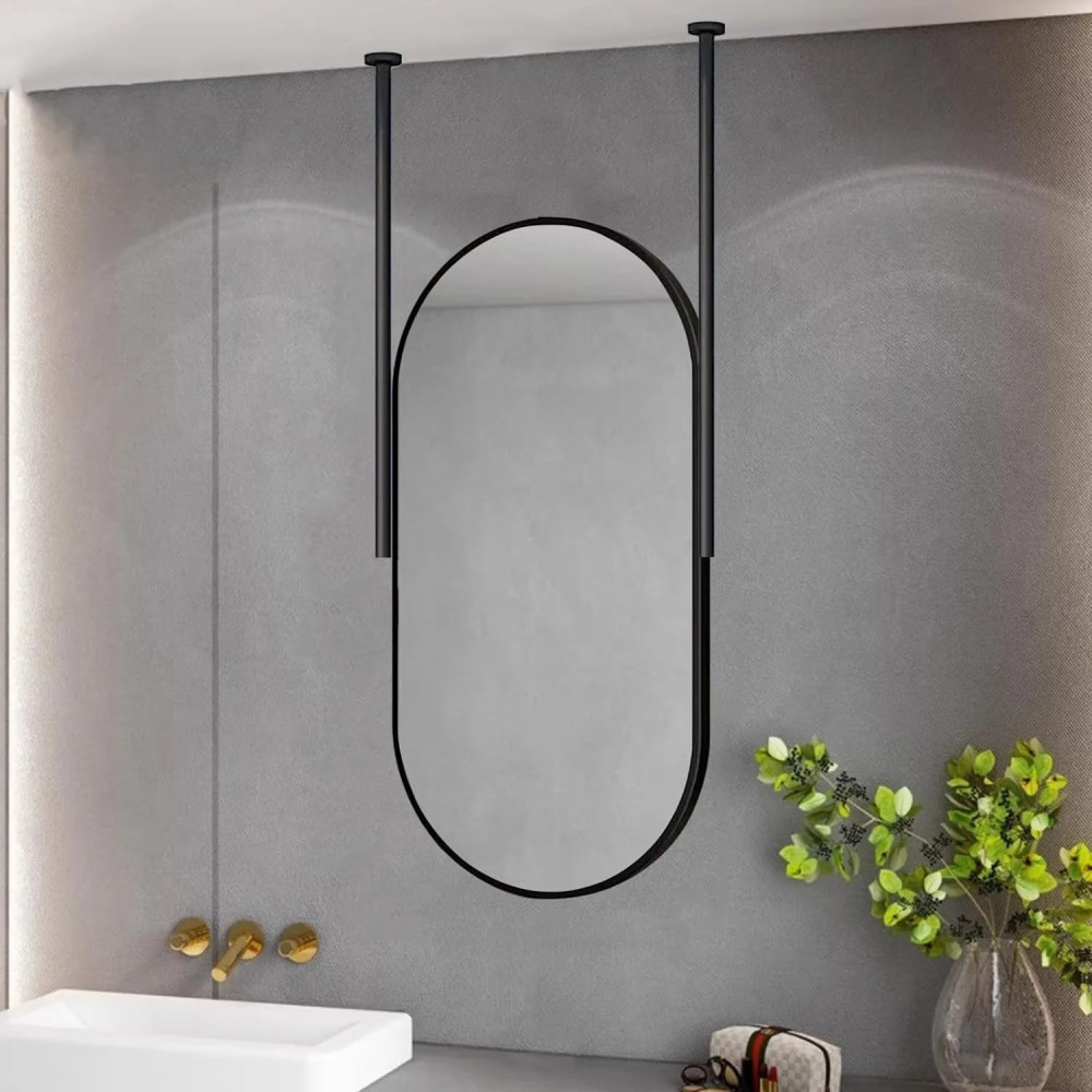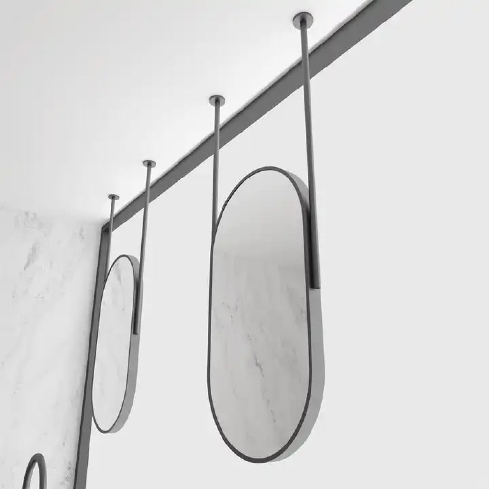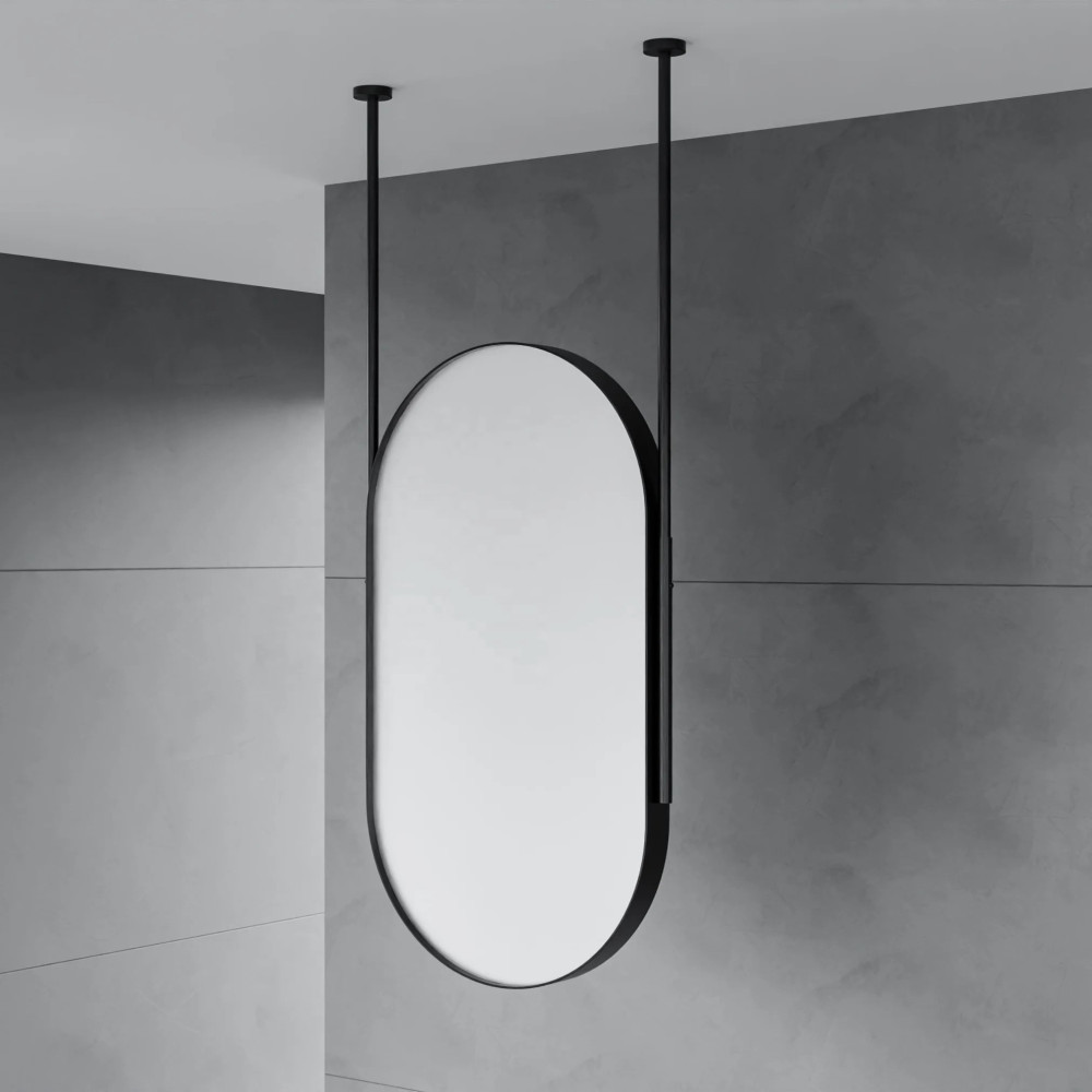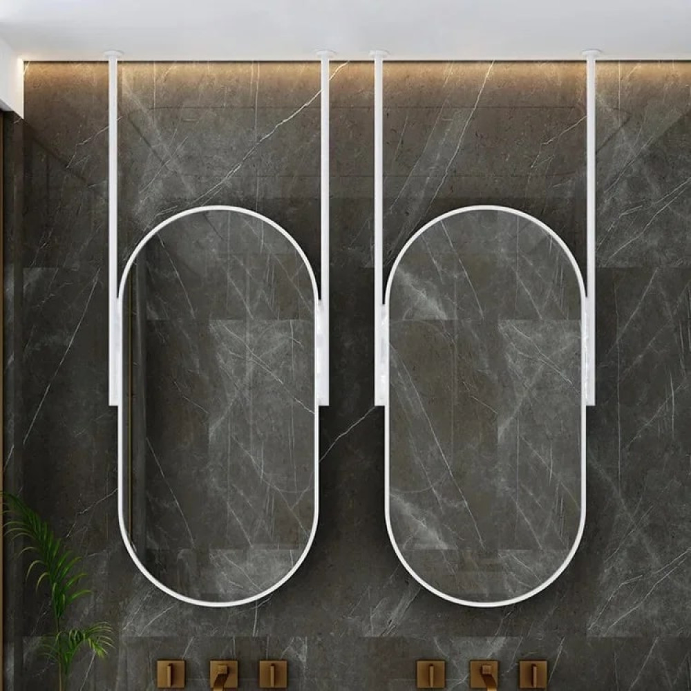 Стильное зеркало вытянутой овальной (капсульной) формы — современное дизайнерское решение для интерьера. Конструкция крепится к потолку на две металлические штанги, что создаёт эффект парящего зеркала и делает его центральным акцентом в помещении.