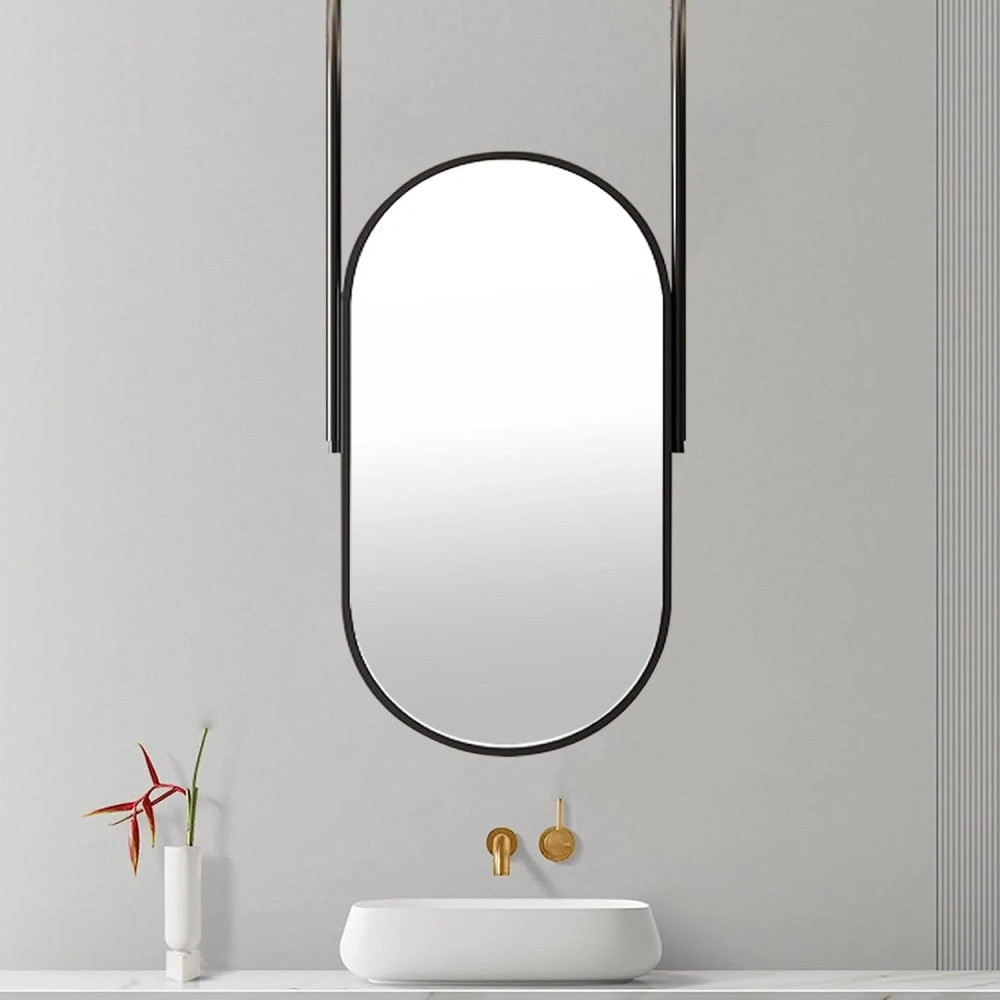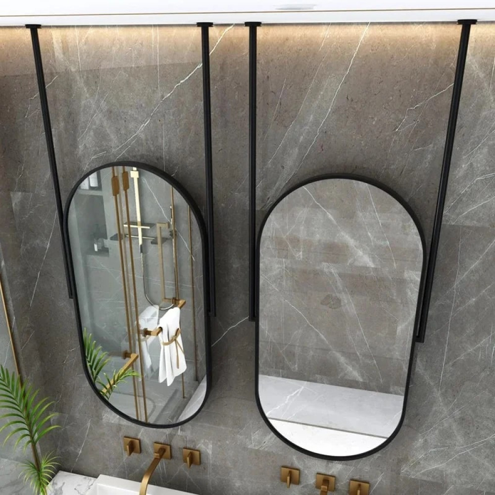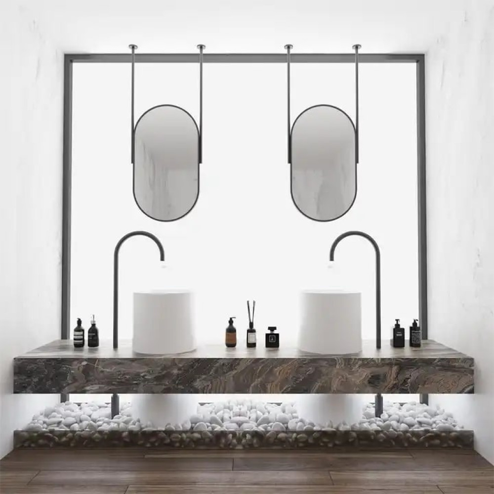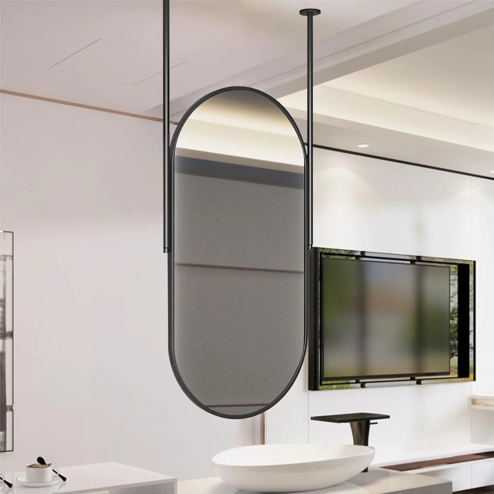 Стильное зеркало вытянутой овальной (капсульной) формы — современное дизайнерское решение для интерьера. Конструкция крепится к потолку на две металлические штанги, что создаёт эффект парящего зеркала и делает его центральным акцентом в помещении.