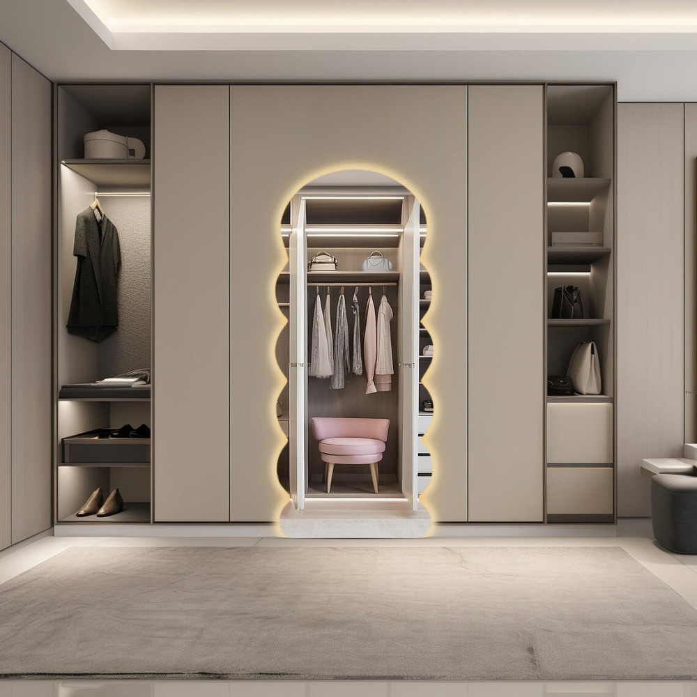 Зеркало E038 — это воплощение современного дизайна и лёгкой элегантности. Его волнистая форма с плавными изгибами придаёт интерьеру мягкость и изысканную динамику, а задняя интерьерная подсветка создаёт атмосферное свечение и эффект парения, наполняя пространство уютом и визуальной глубиной.