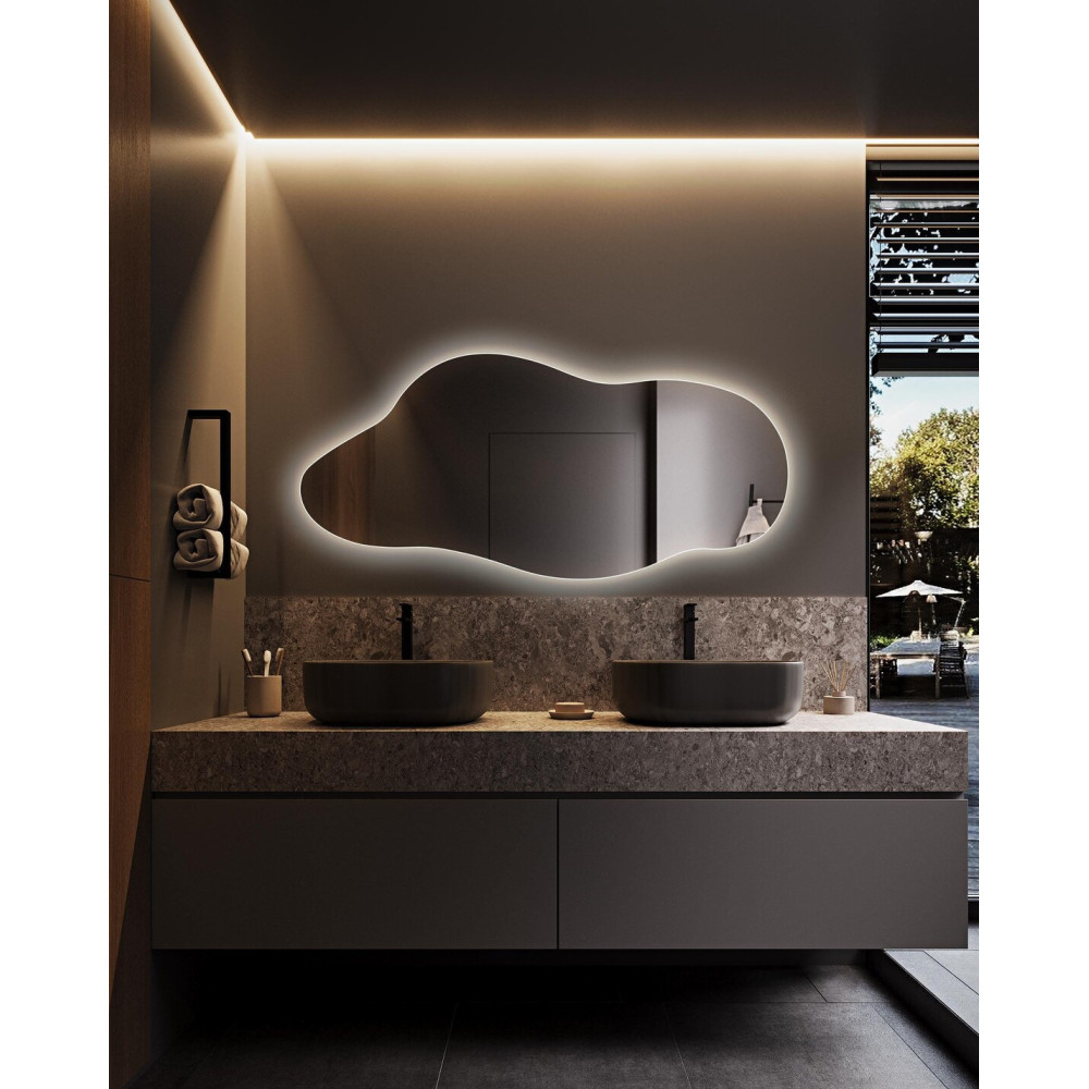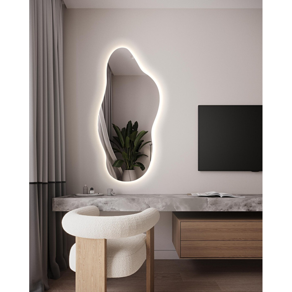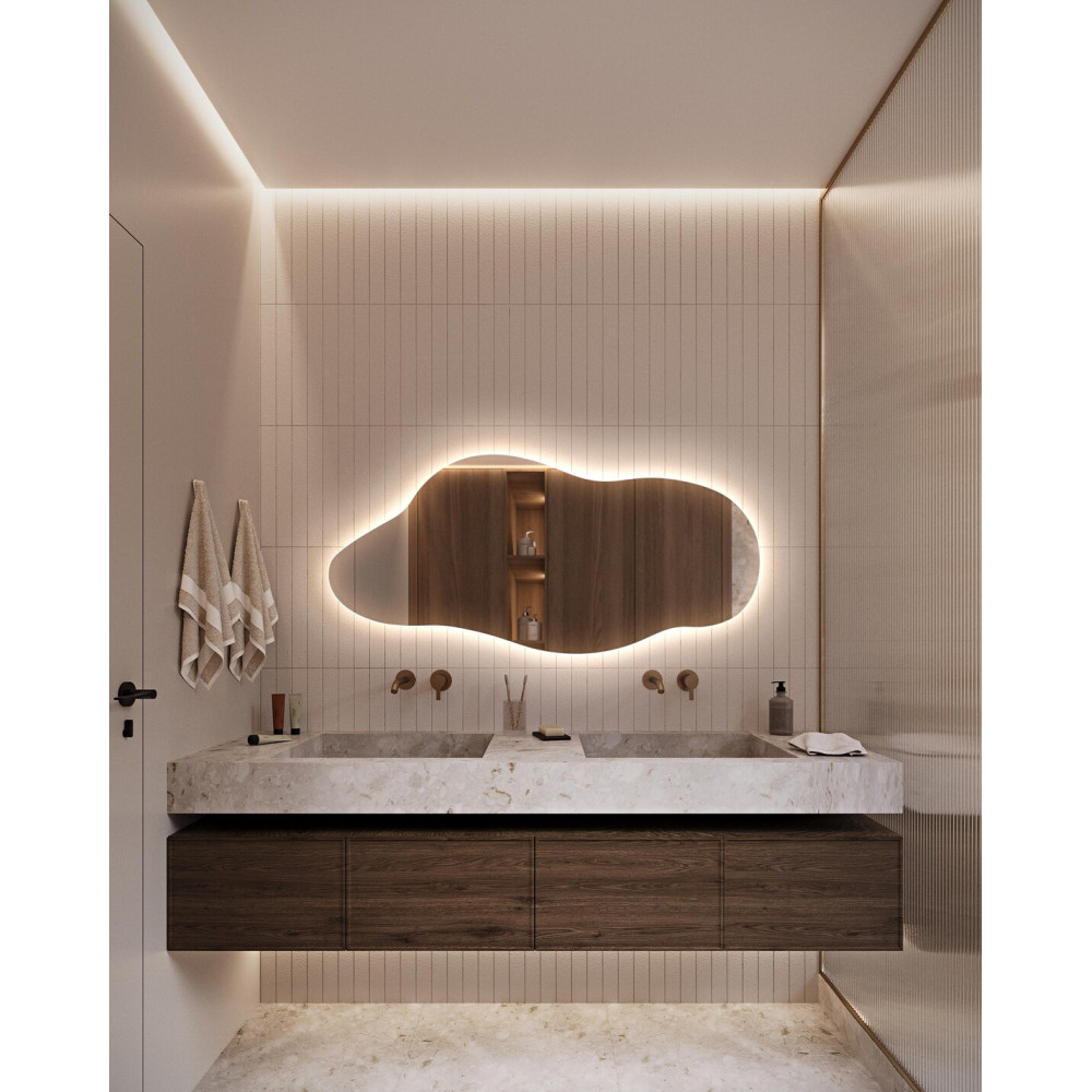Зеркало E019 — современный элемент интерьера с оригинальным дизайном и эффектным освещением. Его нестандартная форма придаёт пространству индивидуальность и динамику, а тыльная контурная подсветка создаёт мягкое свечение по периметру и эффект парения зеркала над стеной.