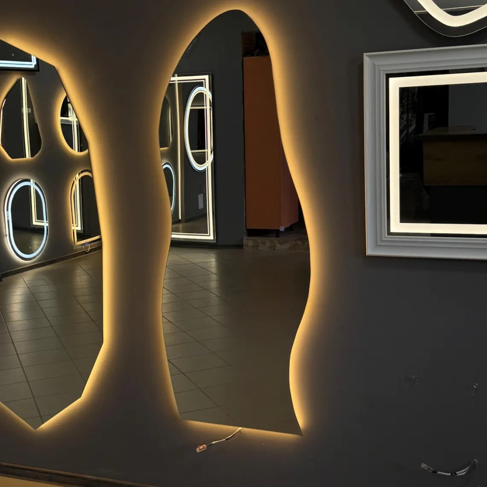 Большое настенное и напольное зеркало волнистой формы в полный рост с тыльной Ambilight-подсветкой E022